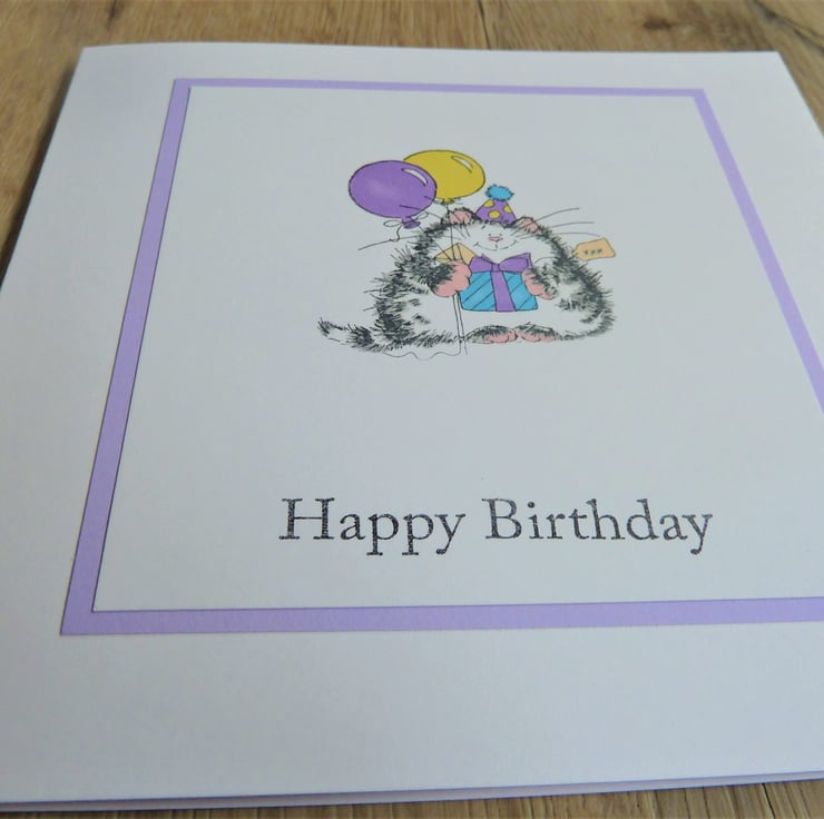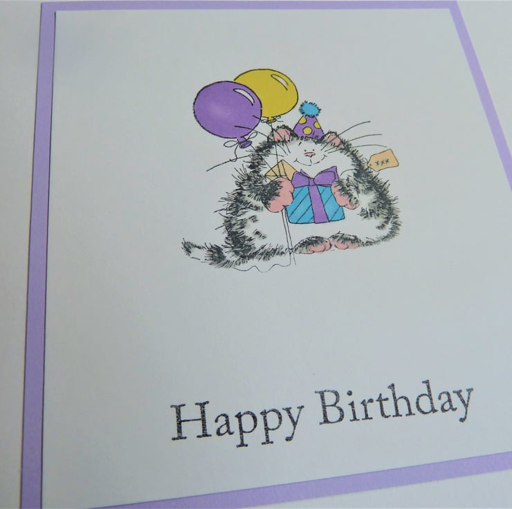 A card which features a hand stamped image of a cat with balloons, it has been hand coloured and the words 'Happy Birthday' have been hand stamped below.
