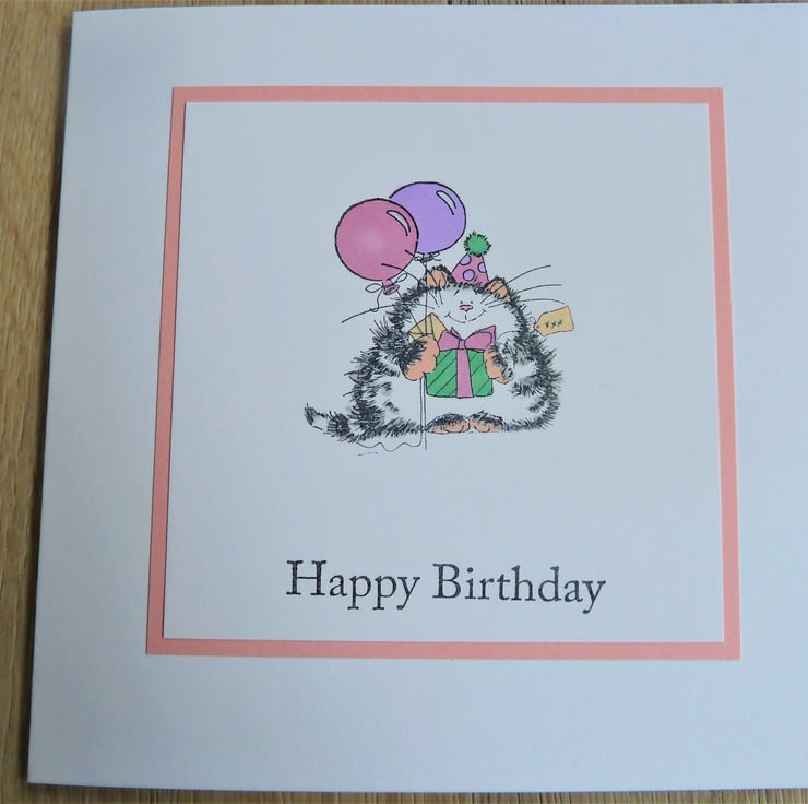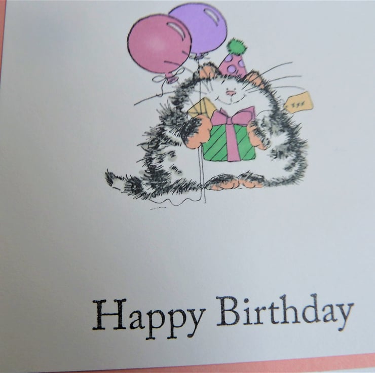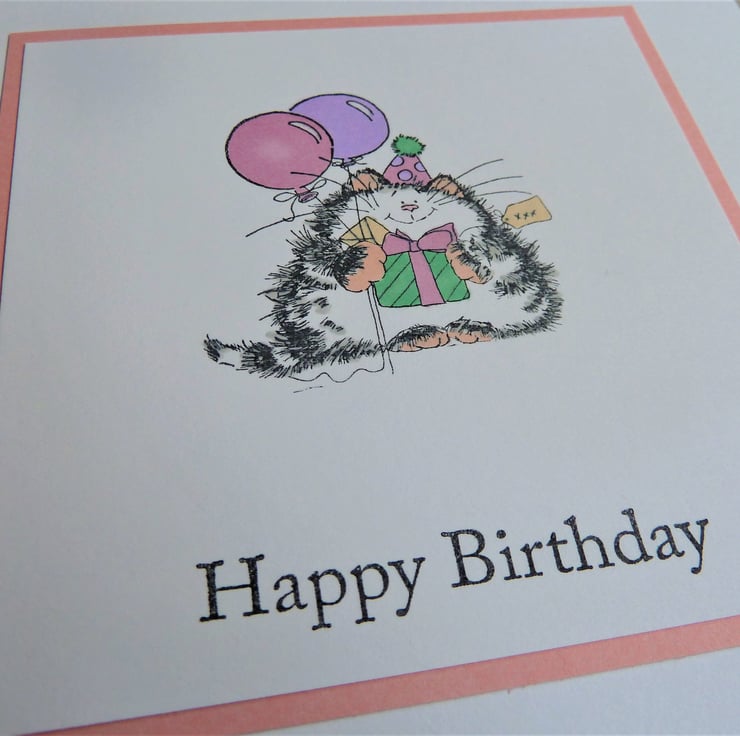 A card which features a hand stamped image of a cat with balloons, it has been hand coloured and the words 'Happy Birthday' have been hand stamped below.