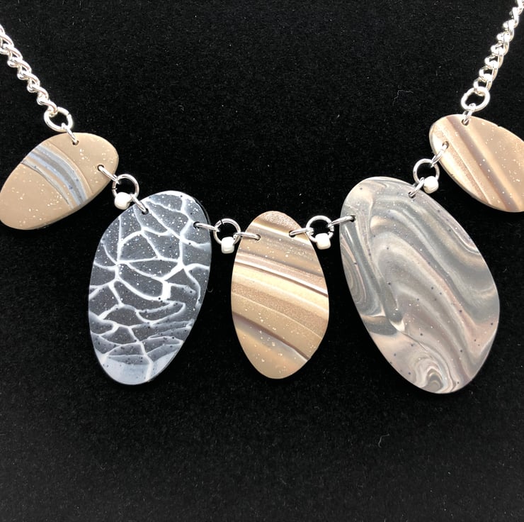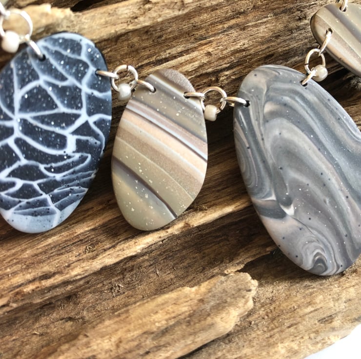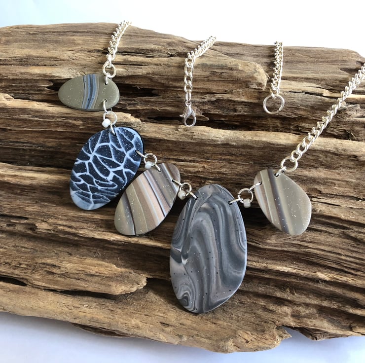 This pebble effect necklace has been made using a mixture of stone coloured Polymer Clay and various techniques.