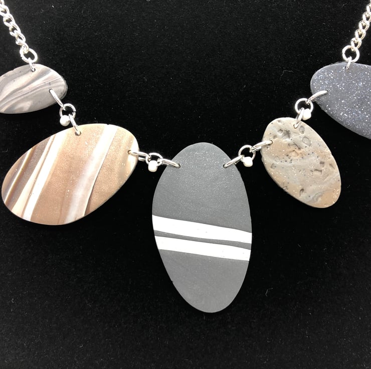 This pebble effect necklace has been made using a mixture of stone coloured Polymer Clay and various techniques.