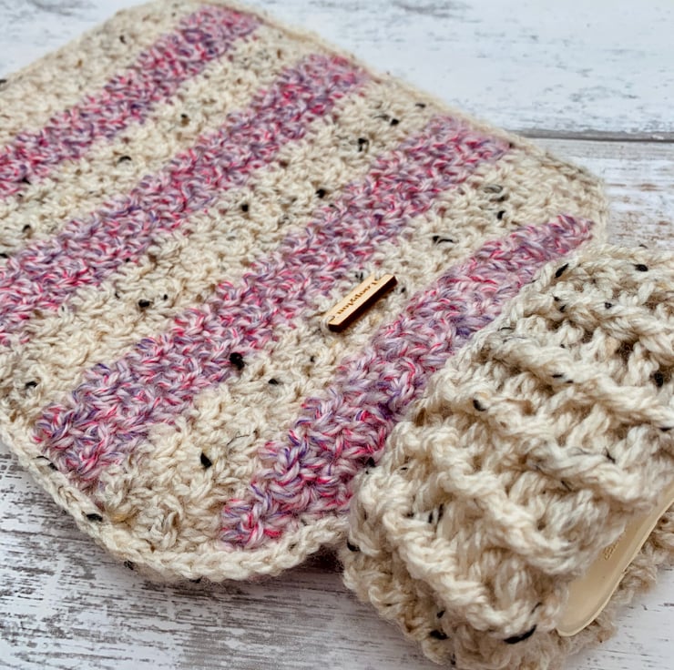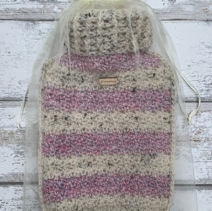 A hot water bottle and handmade crochet cover in tweed pink and purple