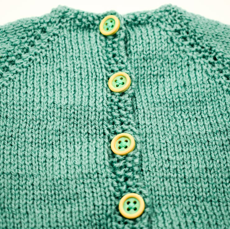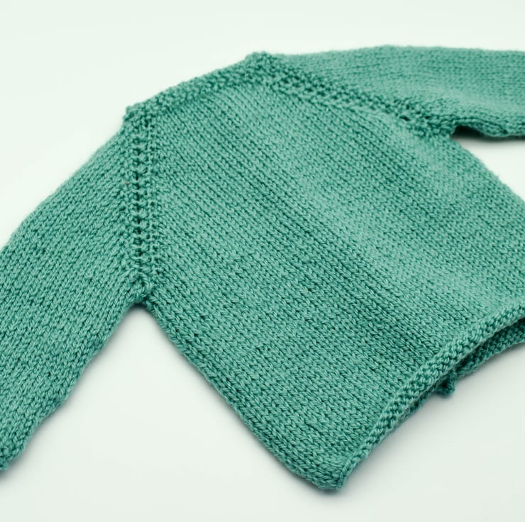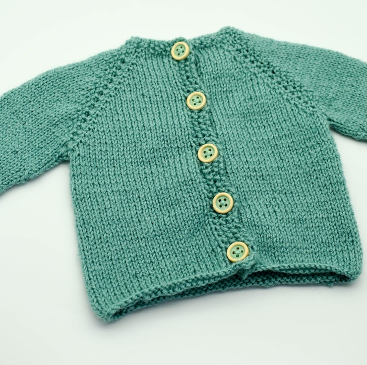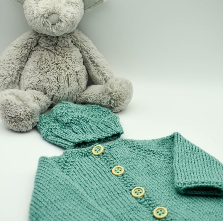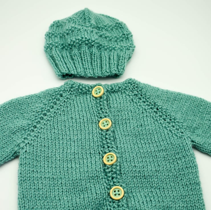 Every item in my shop is hand knitted and designed by myself. The cardigan is knitted in easy to care for acrylic yarn in tiffany green with a simple border. It has five complimentary wooden buttons sewn and comes with a matching textured striped hat.