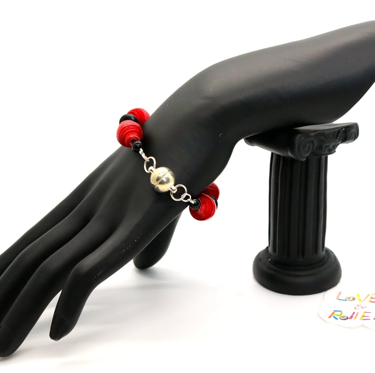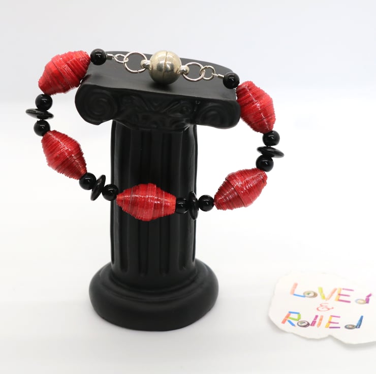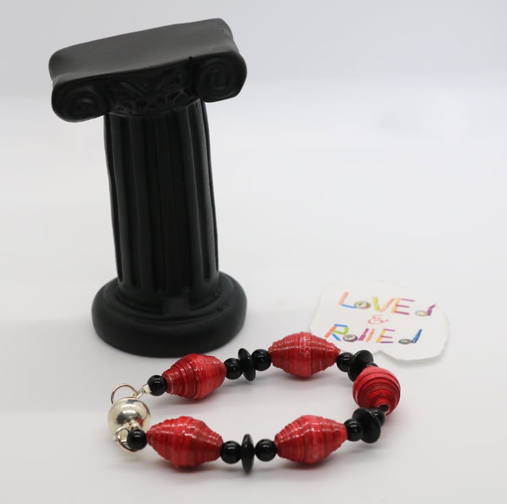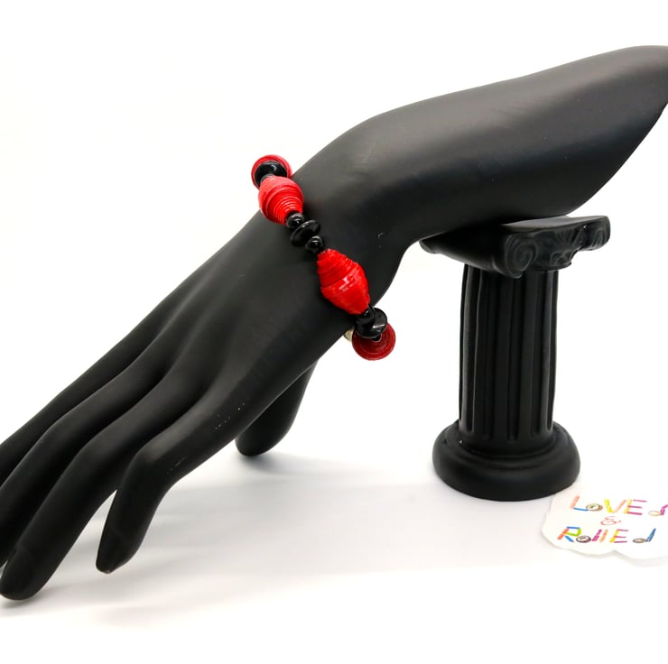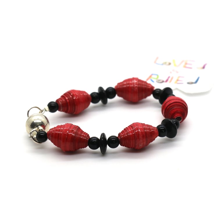 A bracelet made with vibrant red paper beads complemented with preloved shiny black beads.