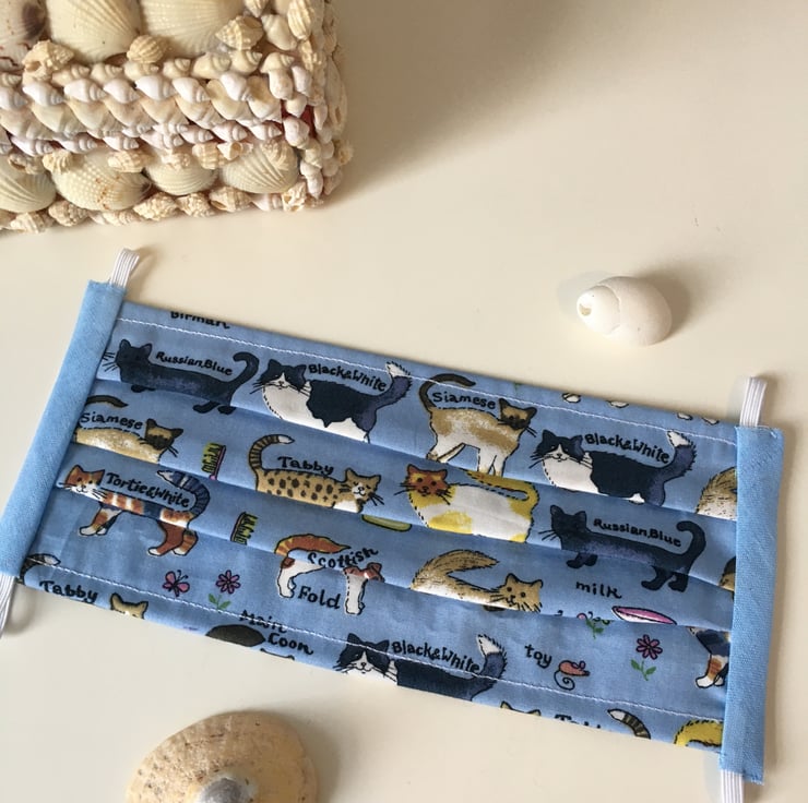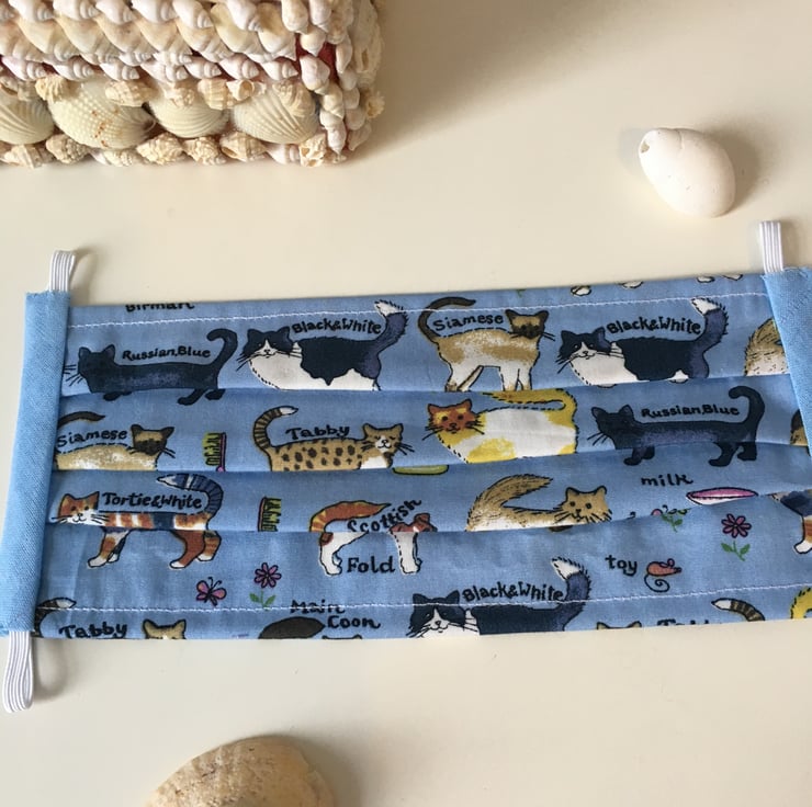Cute blue mask printed with cats, both sides the same.