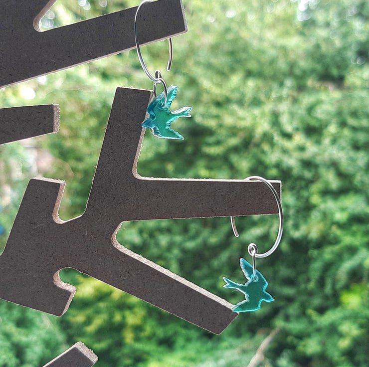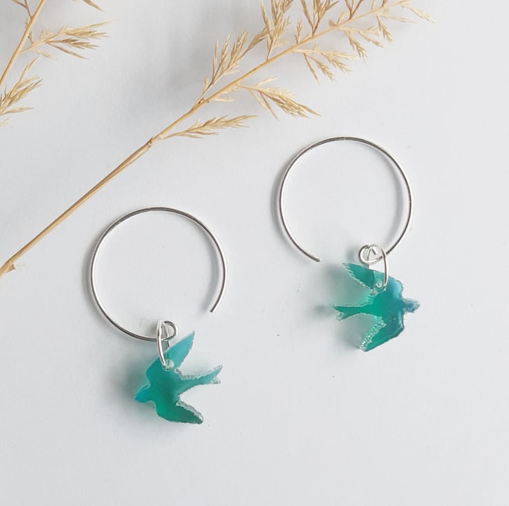Teal swallows on a sterling silver open hoop, Green bird earrings, Swallows, Translucent bird earrings, Bird charms