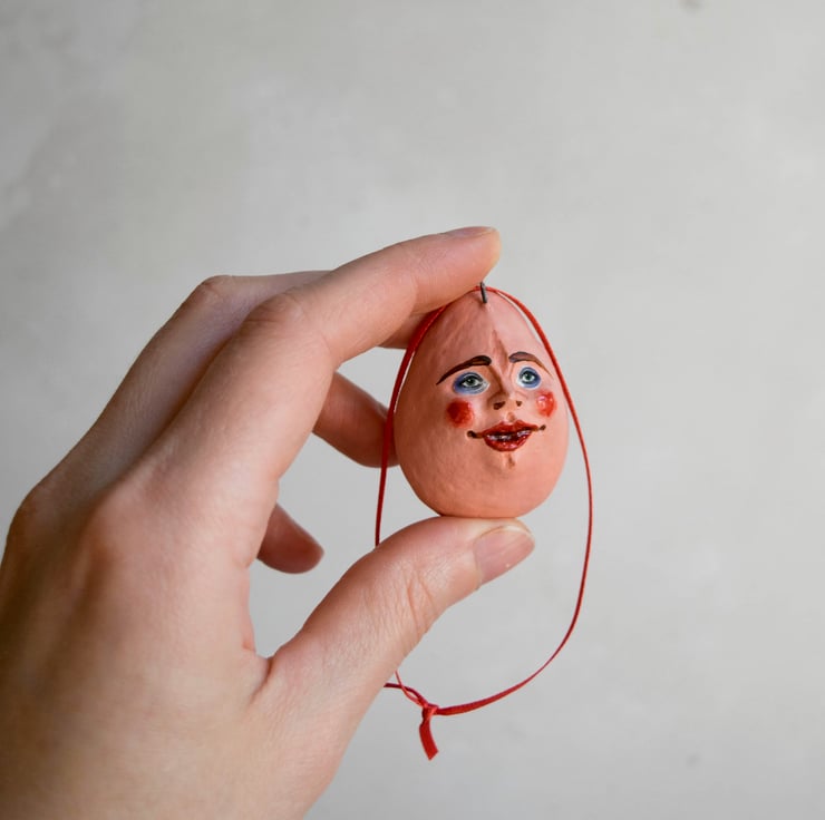 Willie has been painted with a cold finish, so has not been glazed like regular ceramics. He has wonderful glossy cheeks, lips and eyes to contrast against his lovely matt egg head.