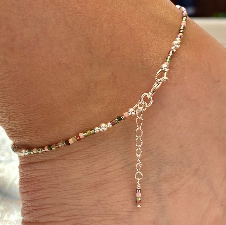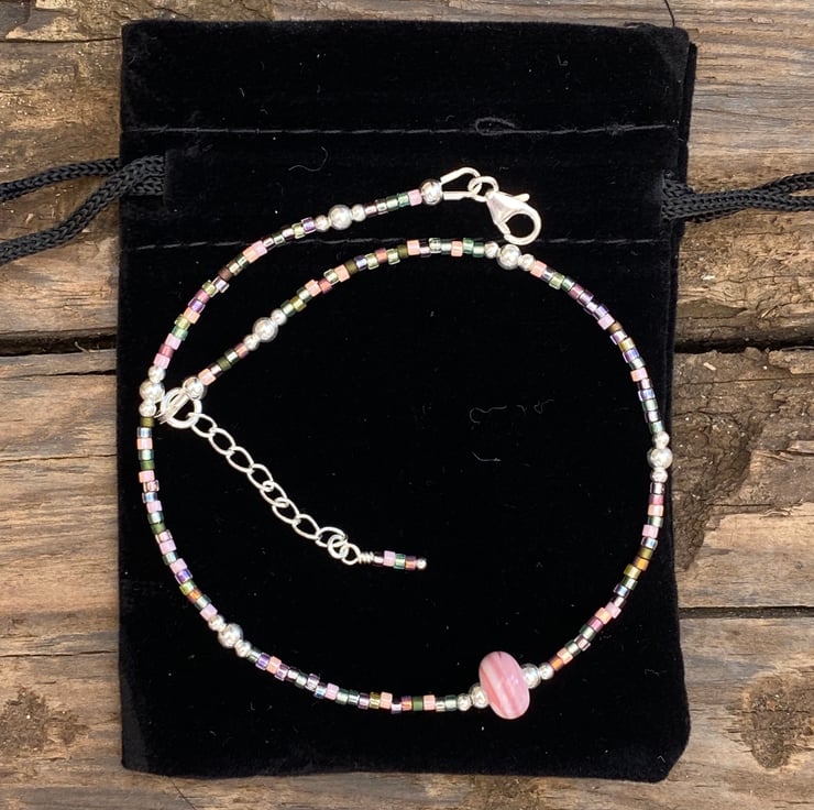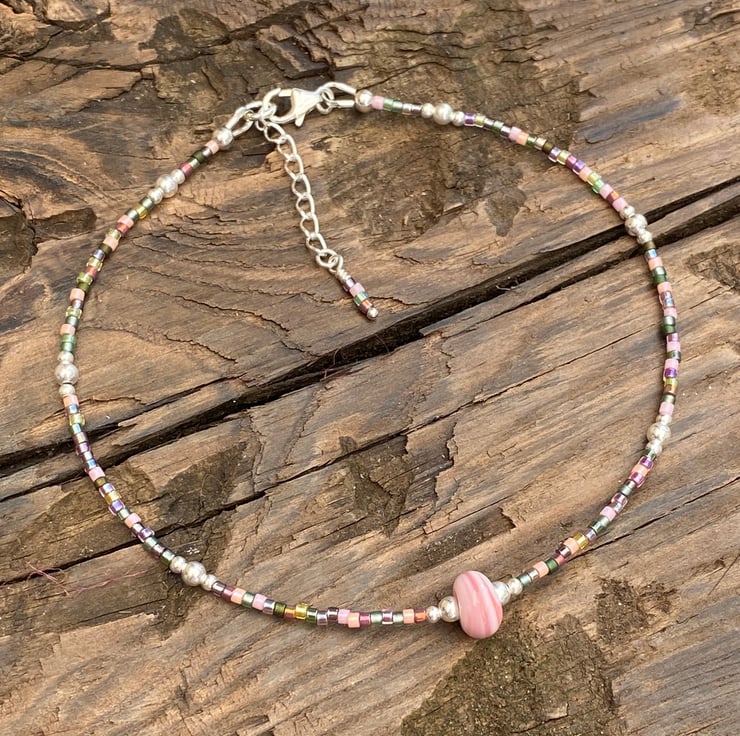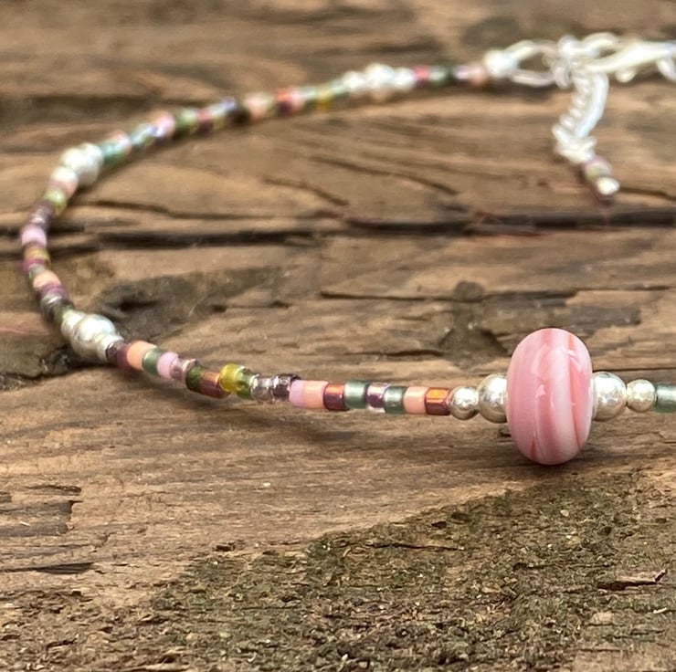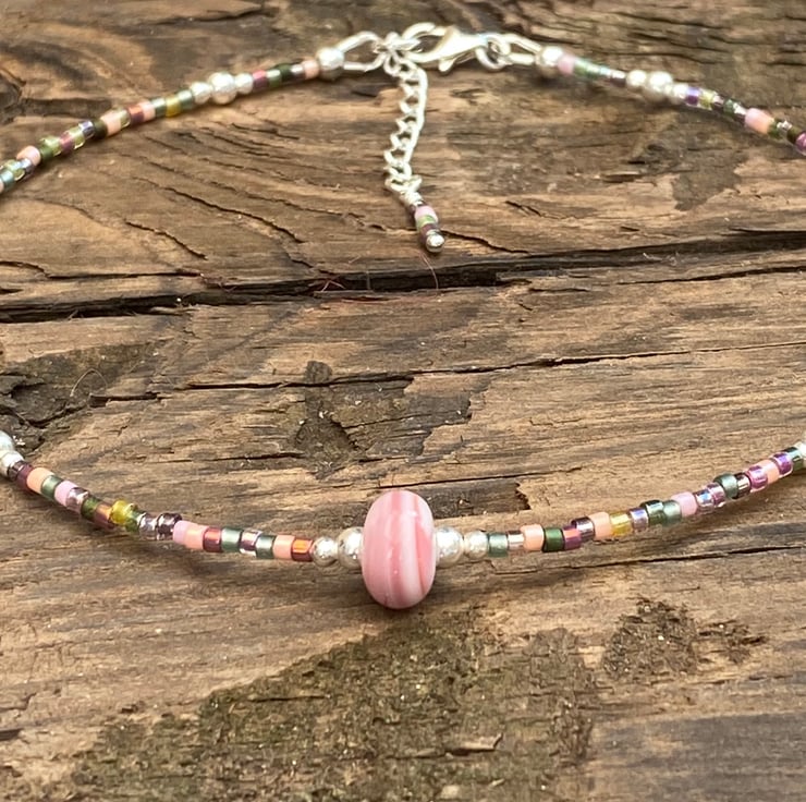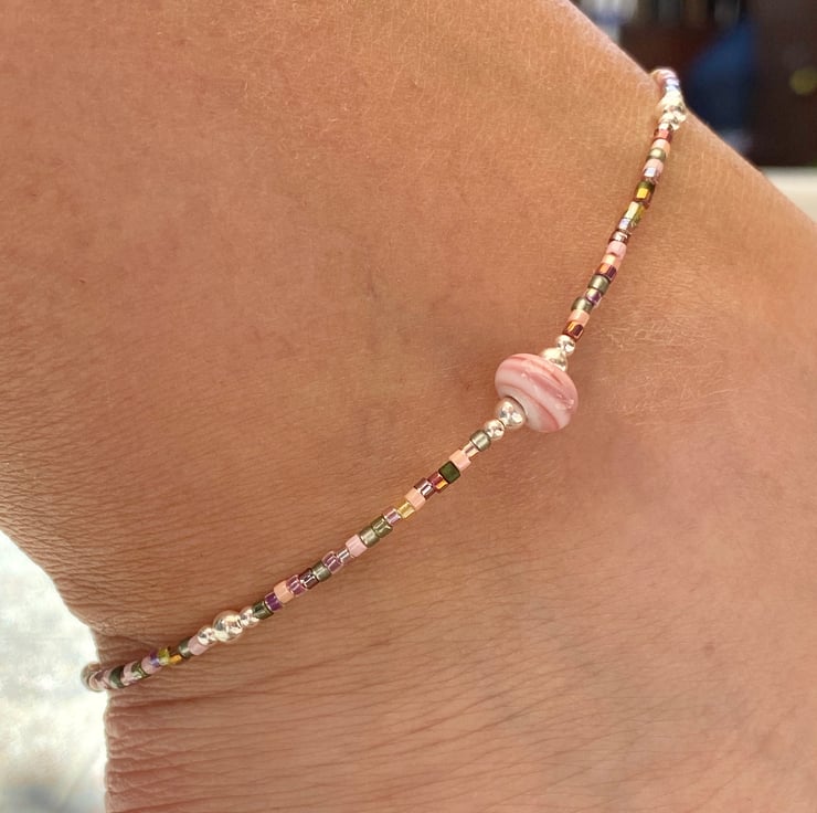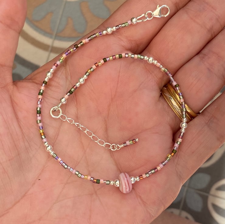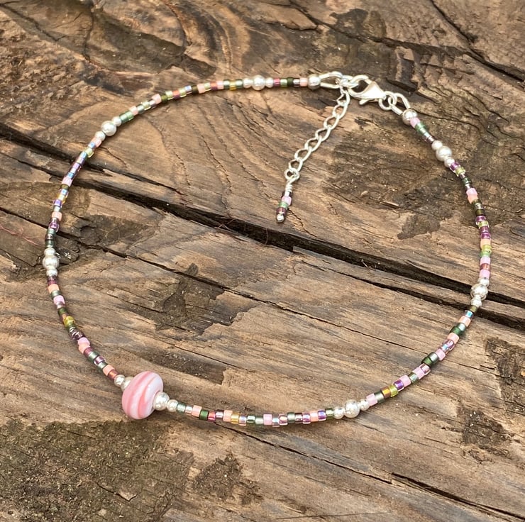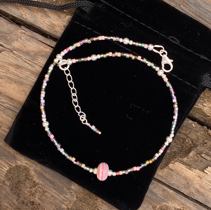 A pale pale pink striped lampwork glass bead sits in the centre of this statement anklet. Beaded with Miyuki bead mix and equally positioned 2/3mm sterling silver beads.
