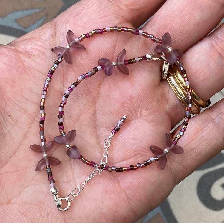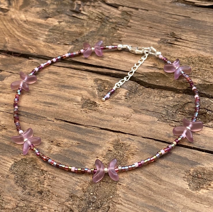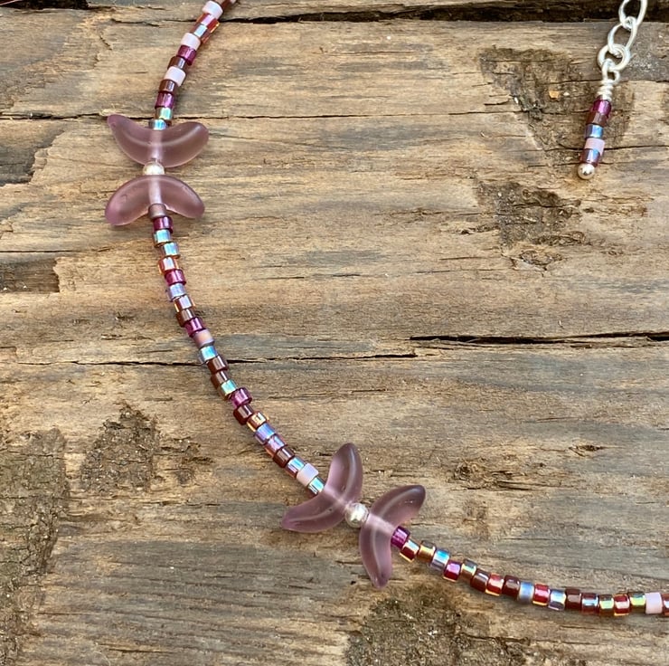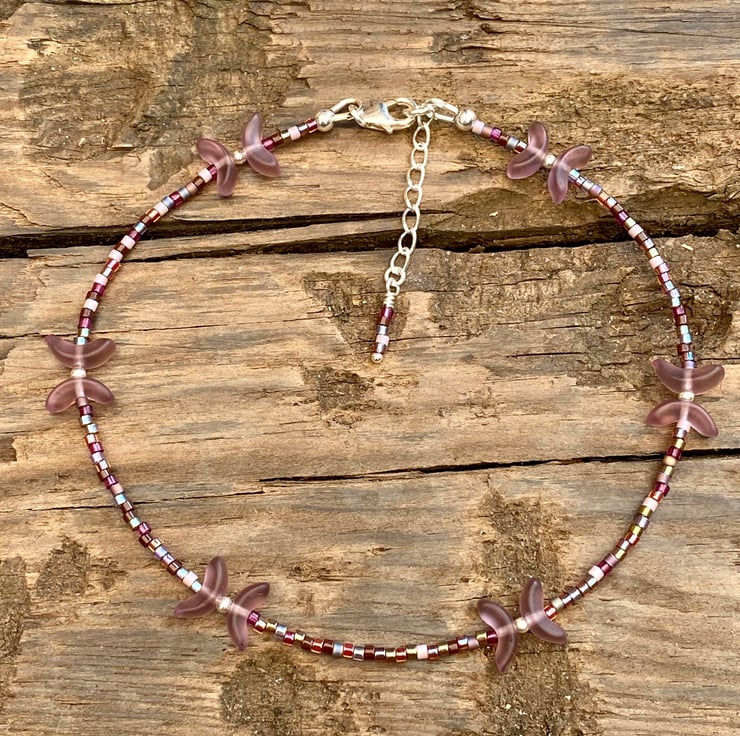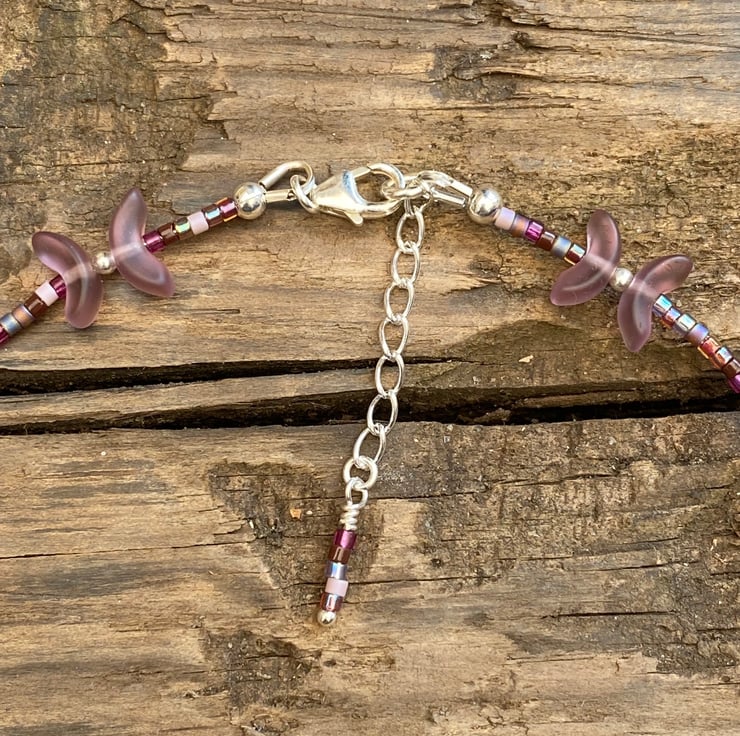 Cute frosted Czech glass shaped beads separated with 2mm sterling silver beads have been beaded with Miyuki bead In complimentary tones.