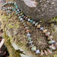 The silver surrounding the stones has a beaten, textured finish, and the metal has been polished to a shine.