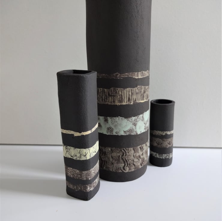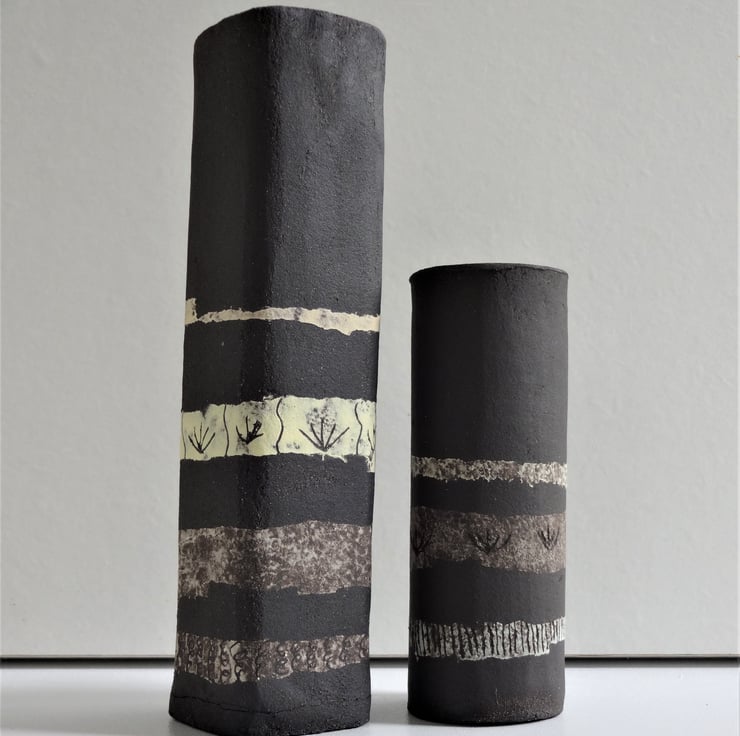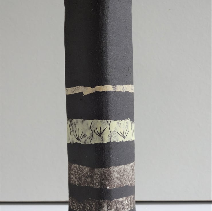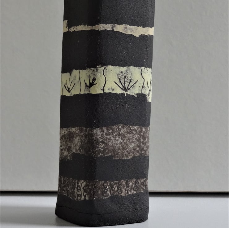 This handmade softly rectangular mini vase is just perfect on its own, or for showing off a single bloom, a few herbs in the kitchen, or for holding a couple of pens or pencils. I decorated the outside with bands of lemon, cream, grey and buff, and carved motifs of grasses and twisted tendrils into the surface colour before firing – a technique known as sgraffito. Choose others from the Lucienne Collection to make an eye-catching group. 14cms high and 13 cms around the base, with my potter’s mark of a swallow in flight impressed underneath.