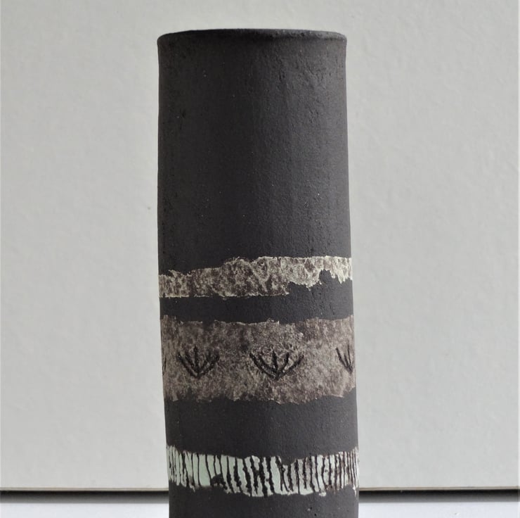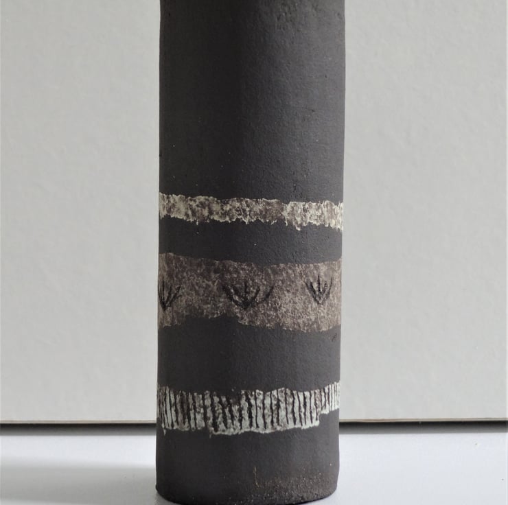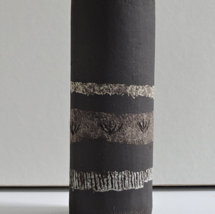 Fran is a sweet mini vase to take a single bud or small posy, or to keep your herb sprigs fresh in the kitchen. Handmade in matt black stoneware ceramic with bands of pastel colours, and motifs of grasses and vertical lines carved into the colour surface before firing – a technique known as sgraffito. Each of my vases is different, so Fran can be grouped with others from the Lucienne collection to form an eye catching arrangement as I’ve shown in one of the images. Underneath you’ll find my potter’s mark of a swallow in flight. The piece is just 9 cms high and 11 cms circumference around the base.