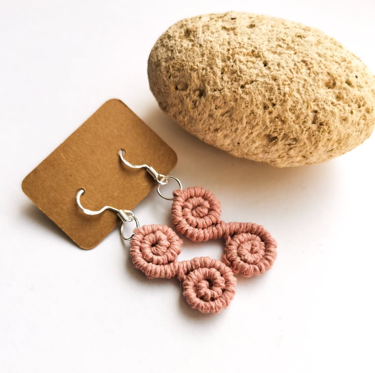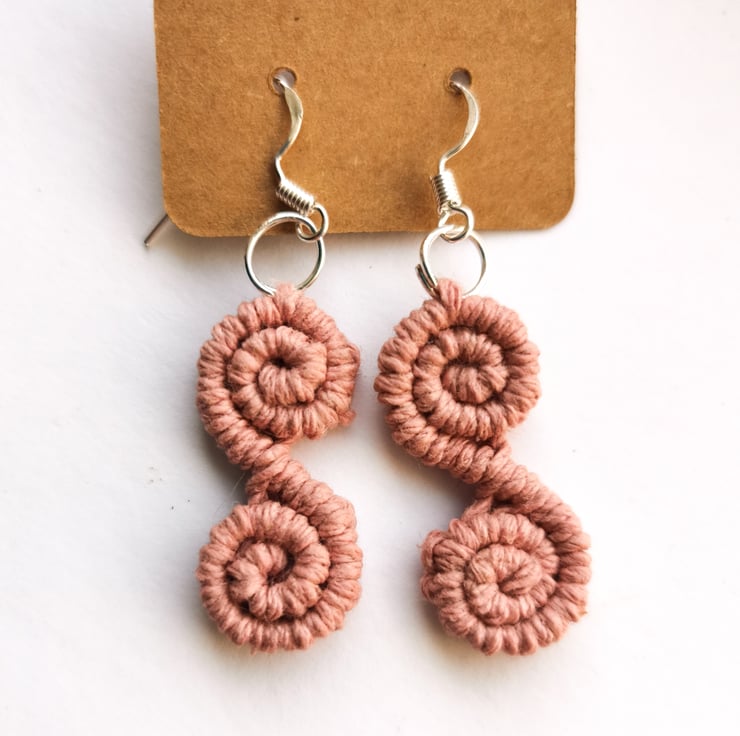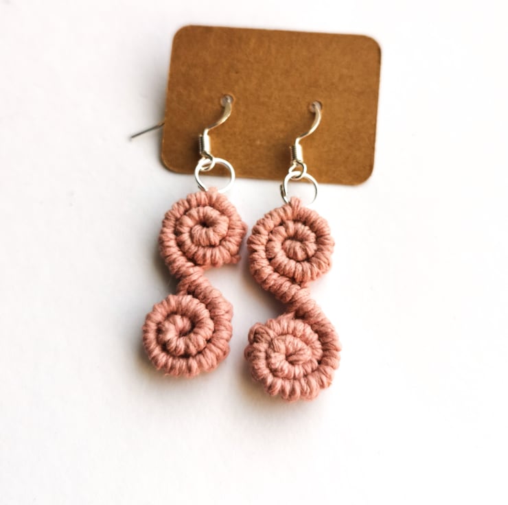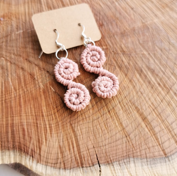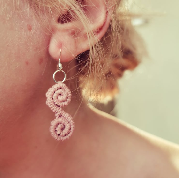 Pink macrame spiral earrings, with sterling silver ear hooks.