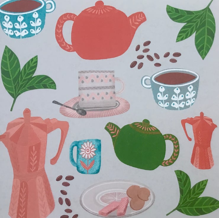 This is a blank greetings card, made from one of my original paintings, it measures 14.5x14.5cm and comes with an envelope. Perfect card for tea or coffee lovers!