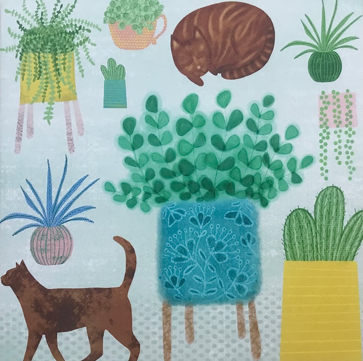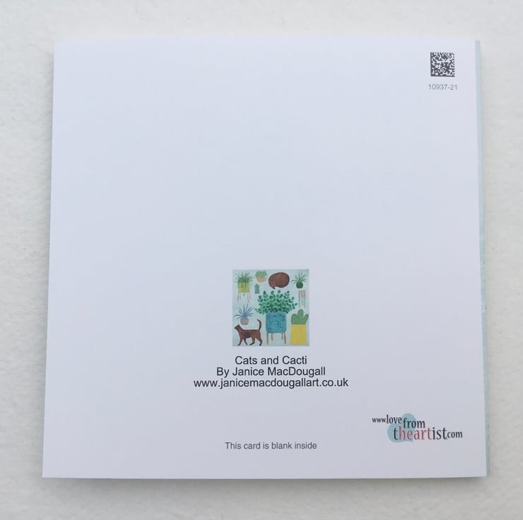 This is a blank greetings card, made from one of my original paintings, it measures 14.5x14.5cm and comes with an envelope. A perfect card for plant and cat lovers!