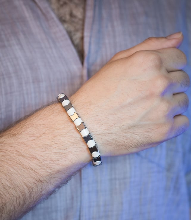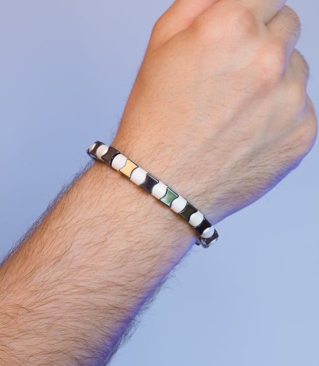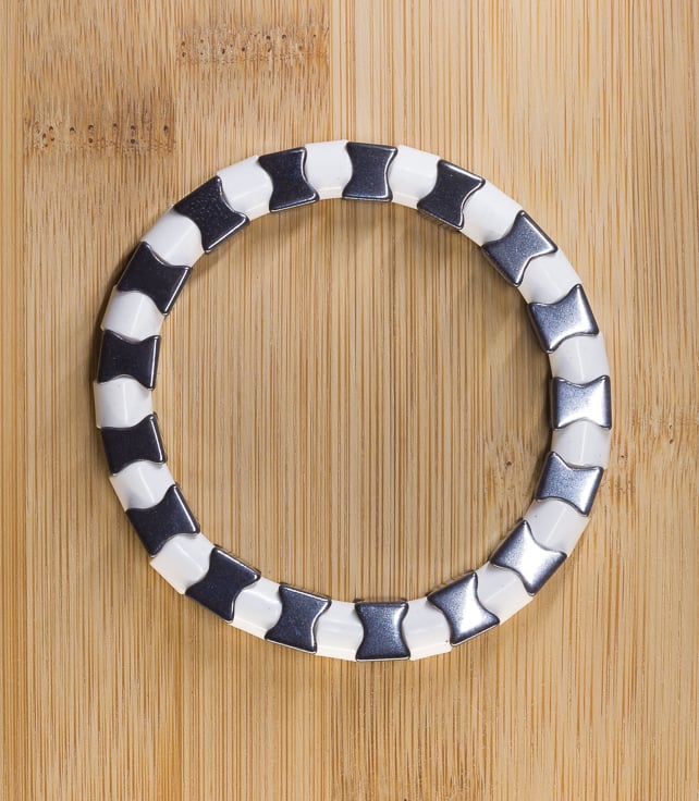 With stretchy jeweller's elastic (to slip over the wrist, no clasp).