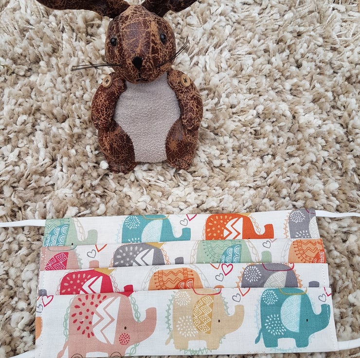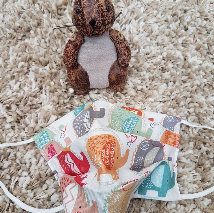 Adult face covering/mask made from a multicoloured elephant print. The face mask is made with 2 layers of cotton forming an inner pocket for a filter (not included) and is fastened over the ears with 2 loops of elastic and a toggle adjuster.