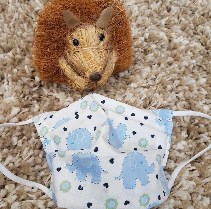 Small Adult/Teenager face covering made from a little blue elephant print on ivory cotton. The face mask is made with 2 layers of cotton forming an inner pocket for a filter (not included) and is fastened over the ears with 2 loops of elastic and a toggle adjuster.