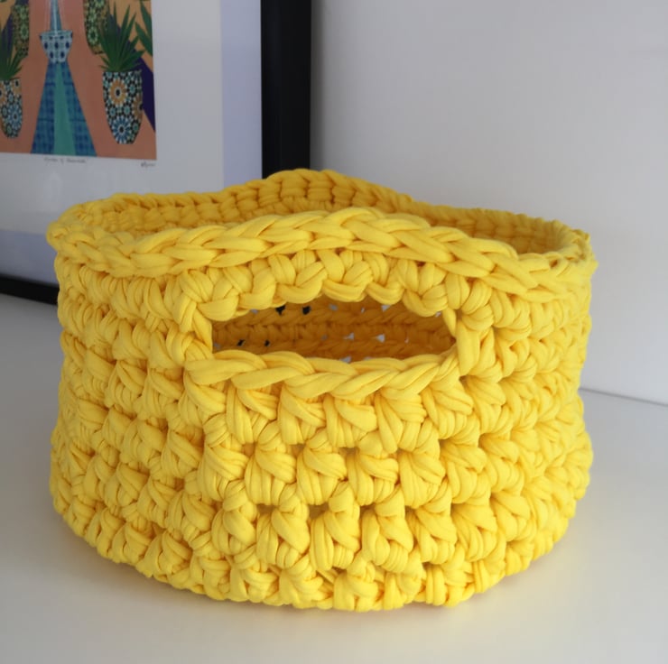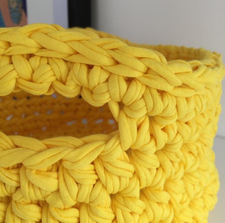 Crochet basket made with upcycled tshirt yarn - sunshine yellow