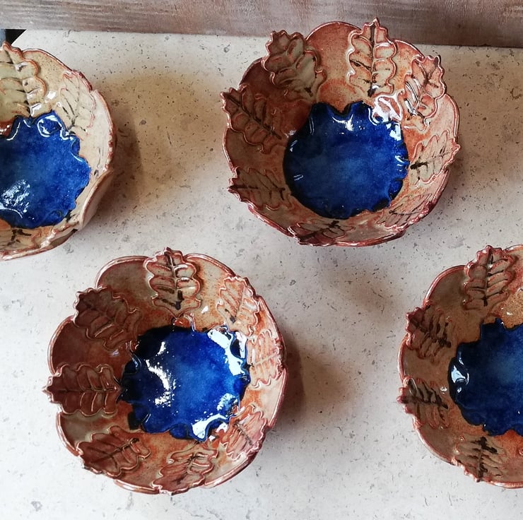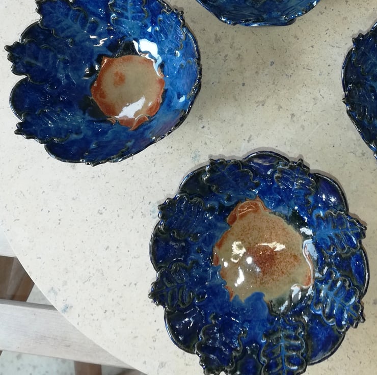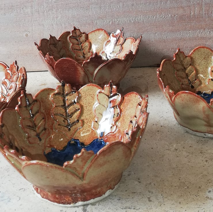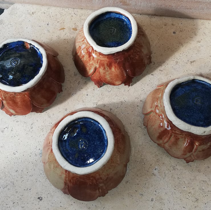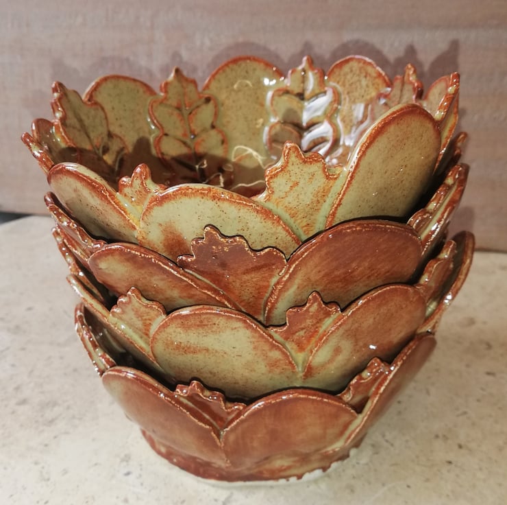 Six lovely stoneware desert bowls created with leaf shaped sides and looking like flowers.