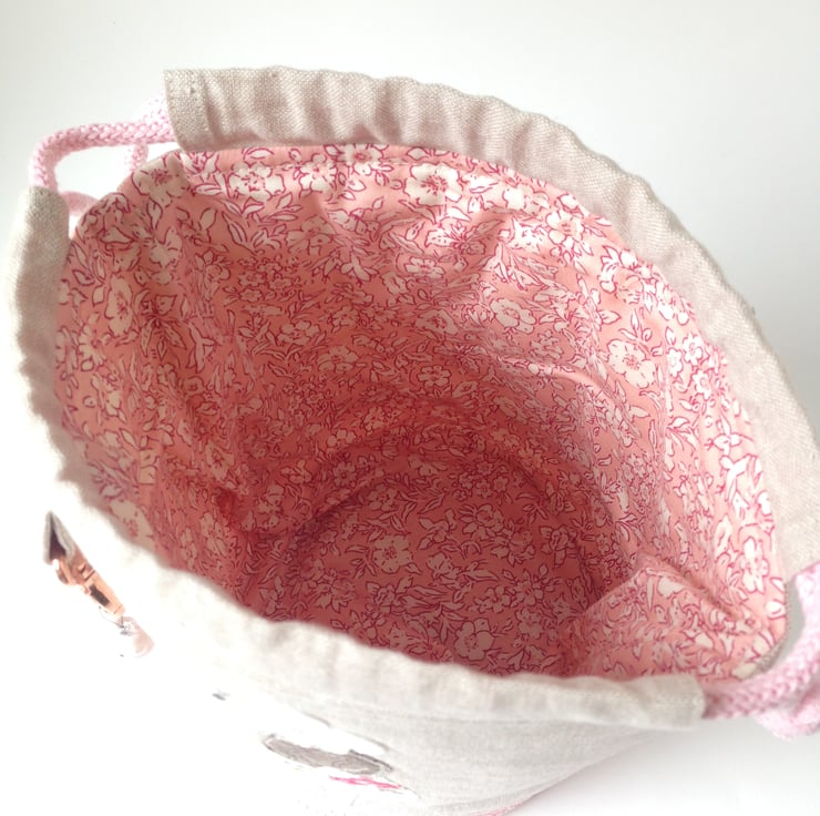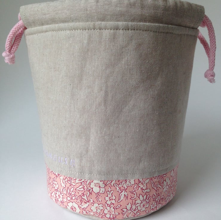 Hand crafted round based adorable little Draw string bag to keep your hand knitted socks or other small projects in.