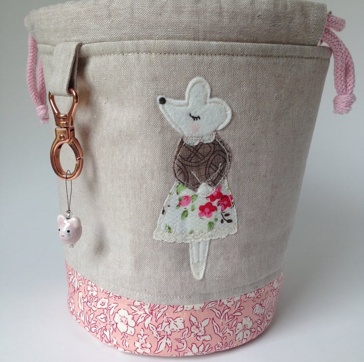 The bag comes with a rose gold lobster clasp to hang your scissors or stitch markers on, and also comes with the little cat stitch marker that you see hanging on the clasp.