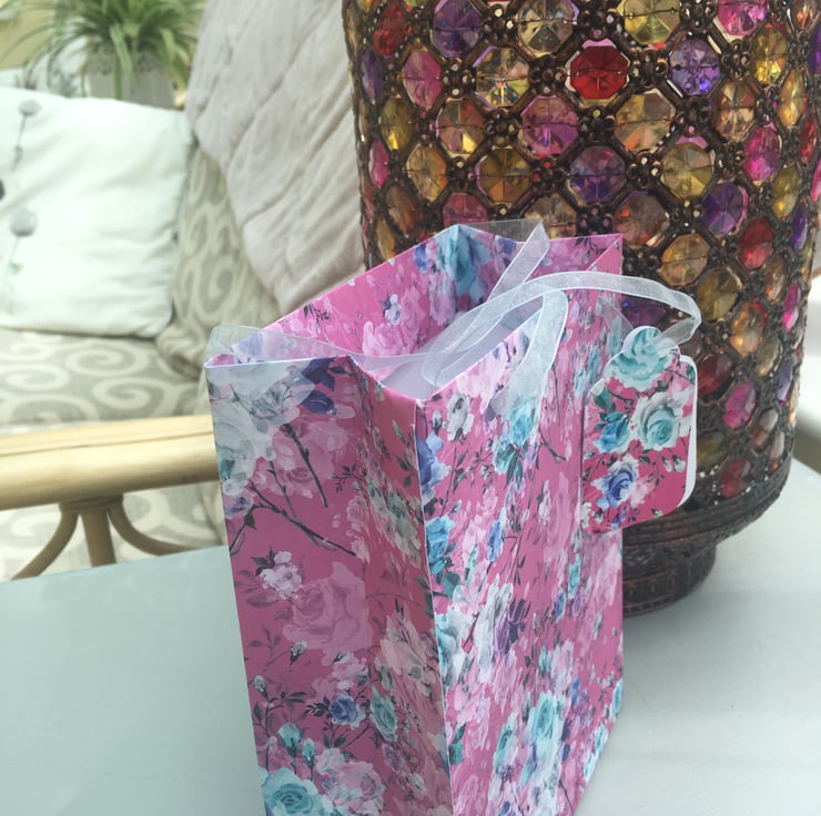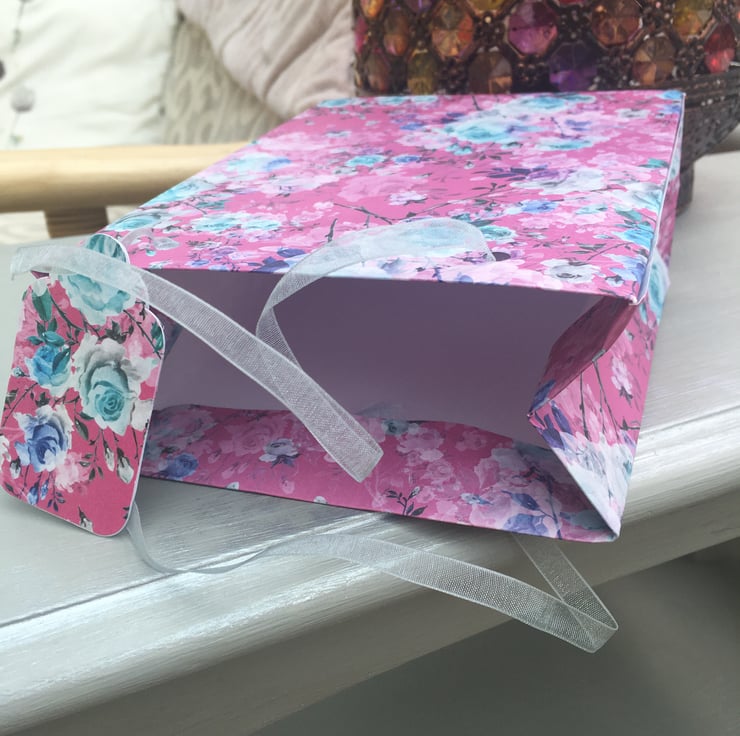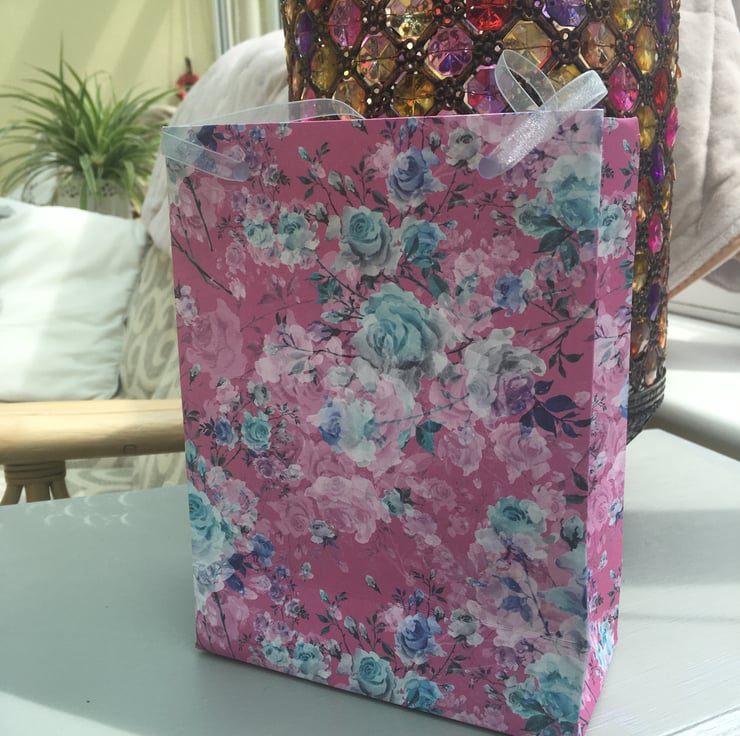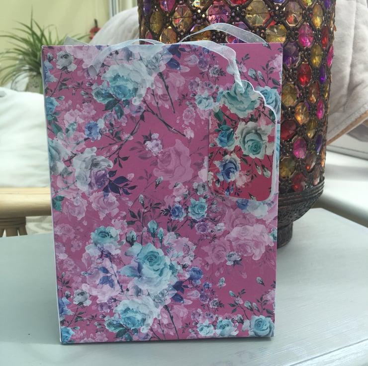 Just right for a small but equisite gift. This pink foral handmade gift bag is just right for that special present. Blousy blue and pink rosed make up this beautiful bag. It comes with organza ribbon handles and 2 matching tags, one says happy birthday, the other has a blank side for your message.