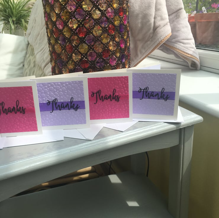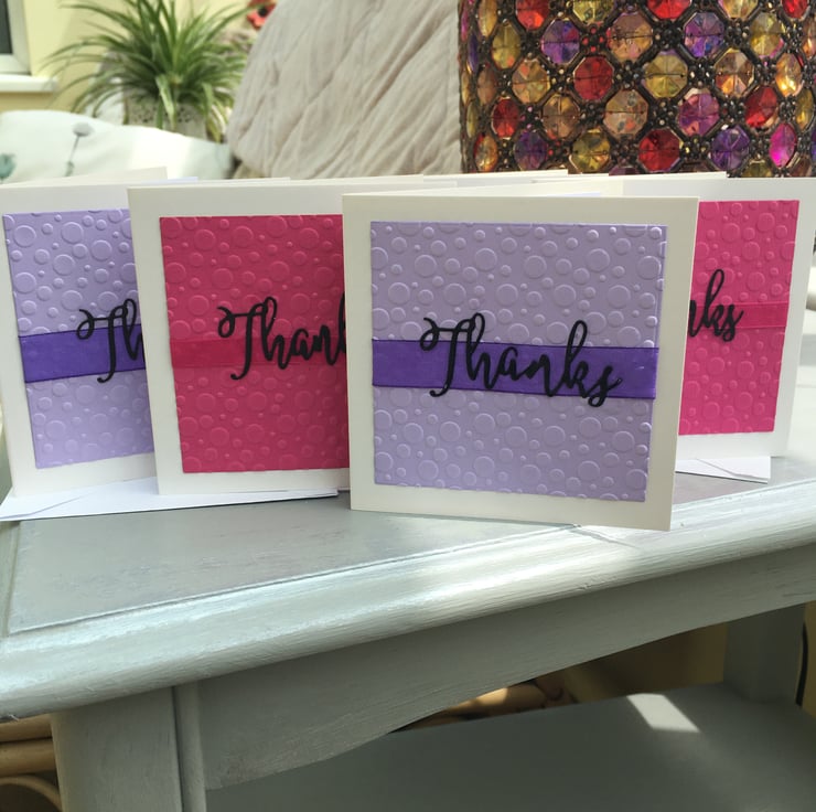 This set of small square cards are all matching but in 2 colours - purple and bright pink. The main colour is an embossed bubble design, this is topped with a contrasting ribbon with a die cut Thanks on top. A simple yet elegant design. All cards come with a handmade envelope.