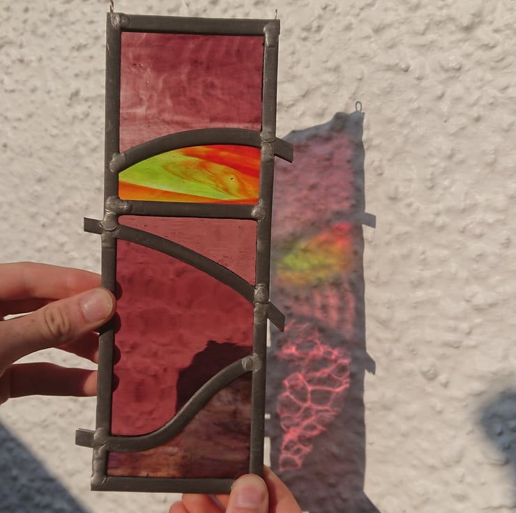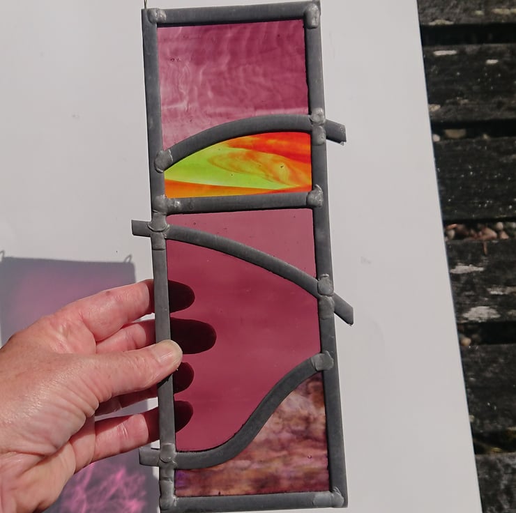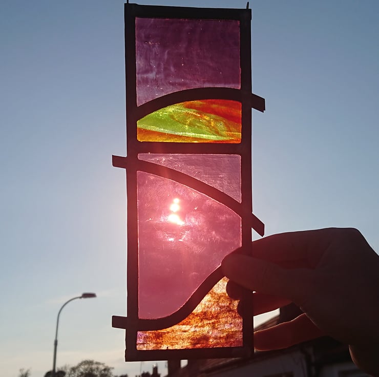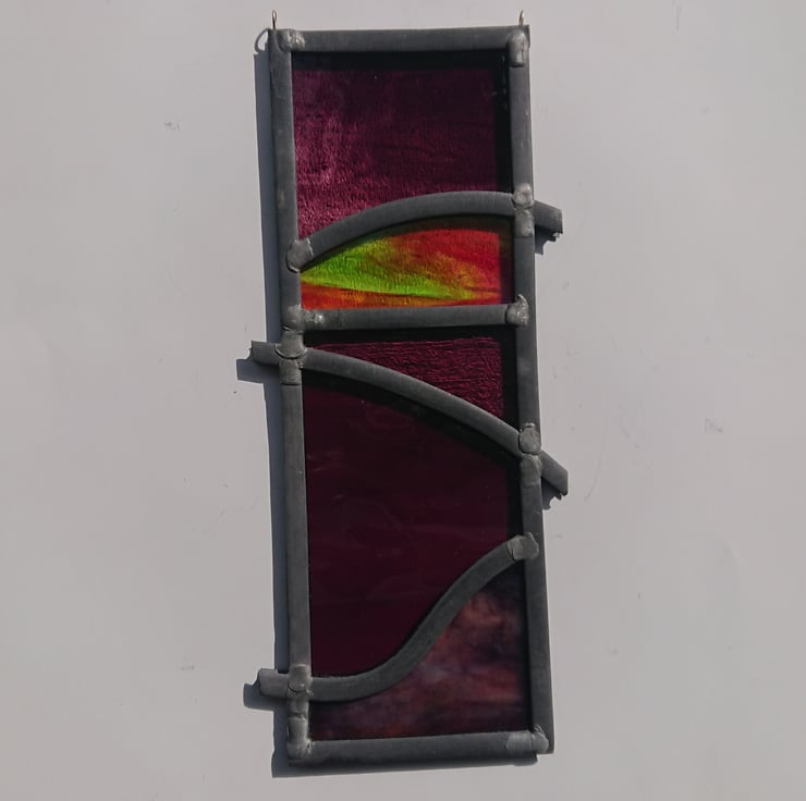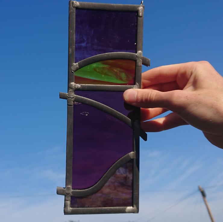 A variety of purple glass makes up the majority of this panel but the key piece is a beautiful iridescent orange-yellow setting sun.