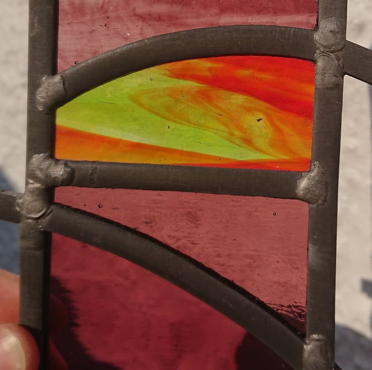Once cut, the panel is then leaded, soldered and cemented. Hooks have been added for hanging this piece in your window.