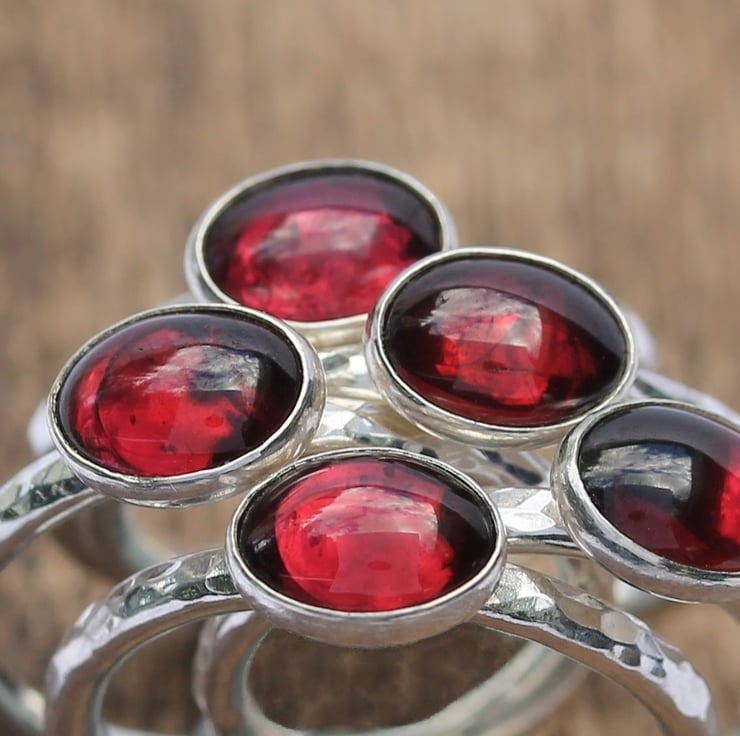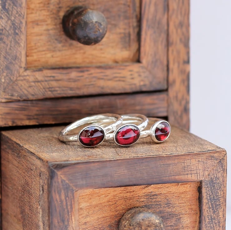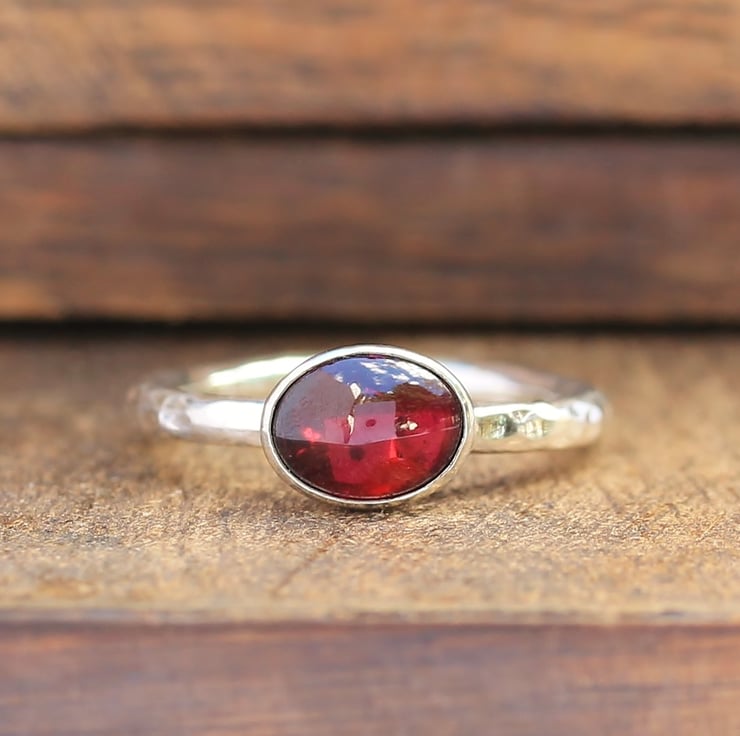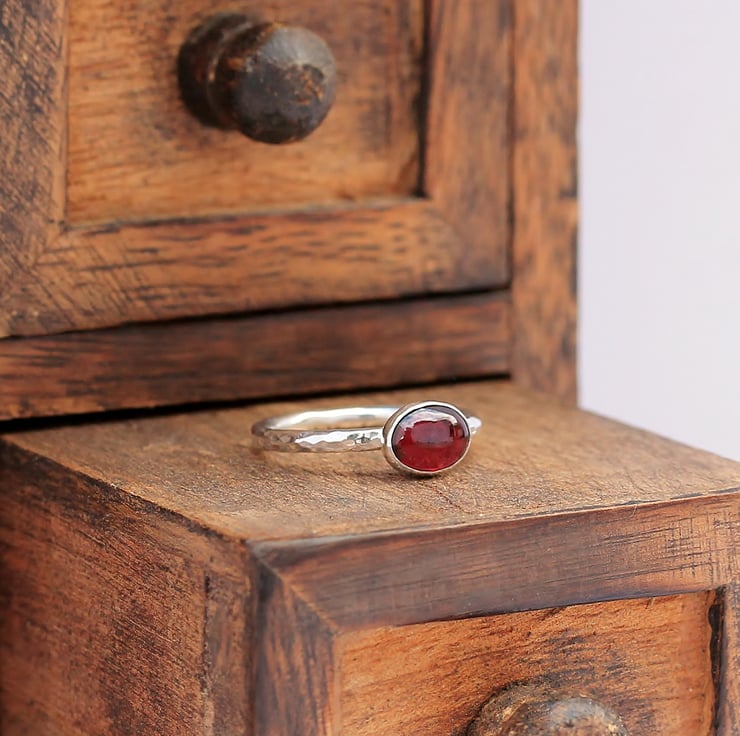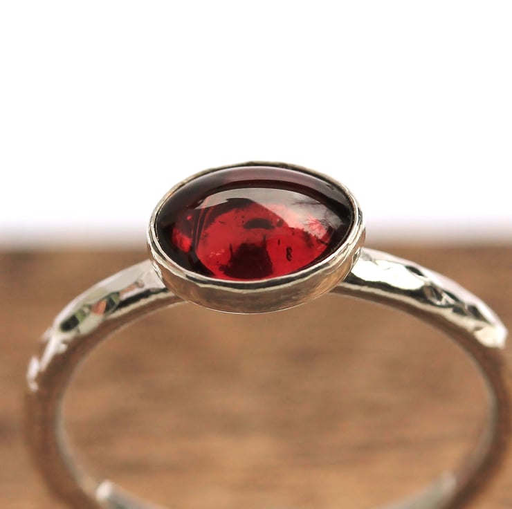 The cabochon garnet has a superb deep red colour. The silver band is hammered to add texture and then tumble polished to a bright shine finish.