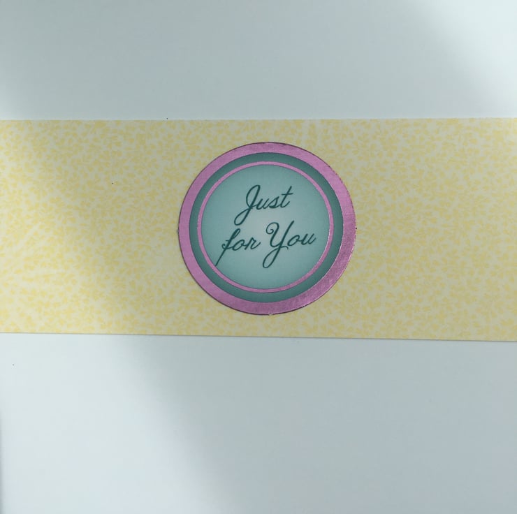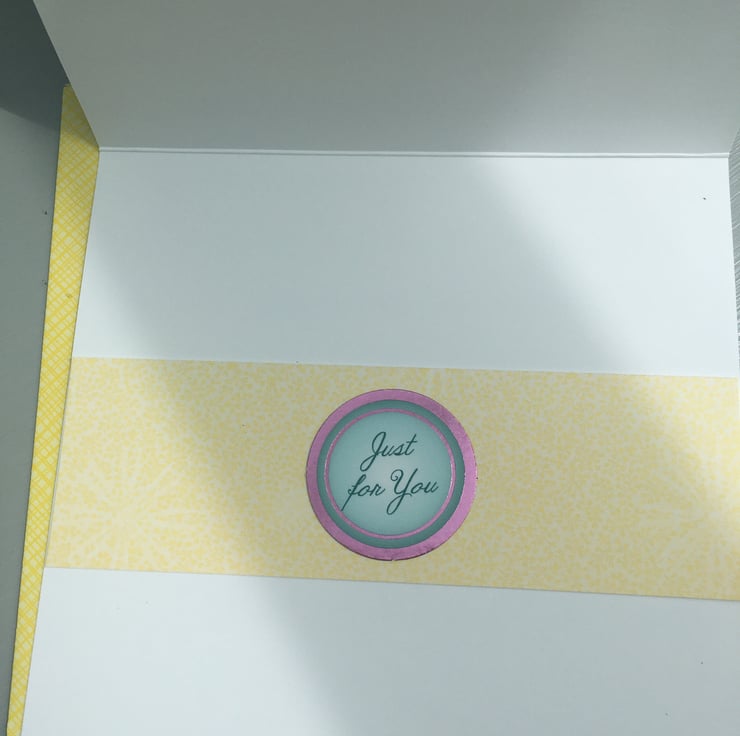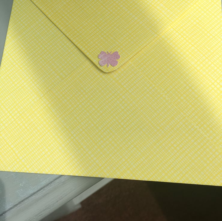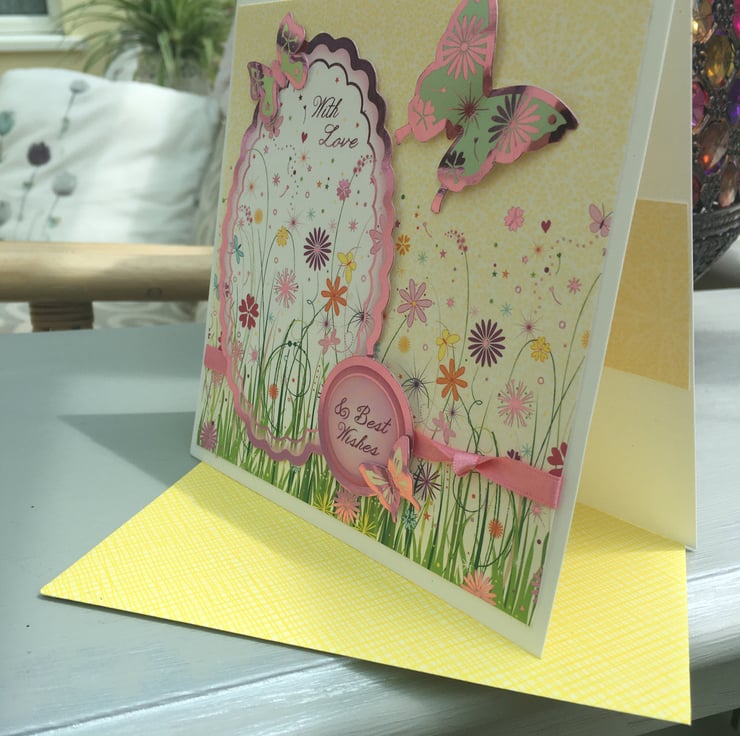 A pretty and delicate butterfly card to send your love and best wishes. This could be for any number of occations including birthday, anniversary or just because. This delicate pale yellow card is sprinkled with tiny flowers and butterflies. The topper is edged with mirroe pink and is covered in matching flowers, the greeting says with love and a matching topper says & best wishes. The design is finished with a pink knotted ribbon and several sparkling butterflies. Inside the card a yellow band has the greeting just for you on it. The card comes in a handmade envelope.