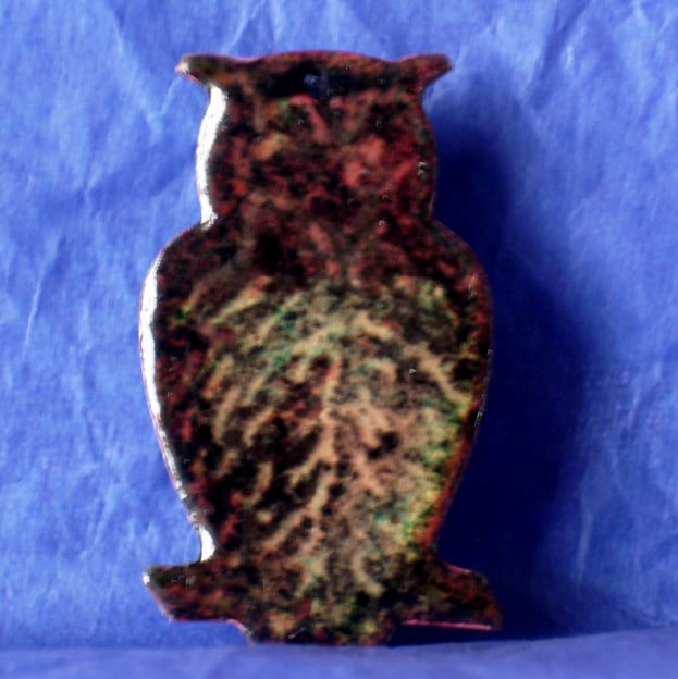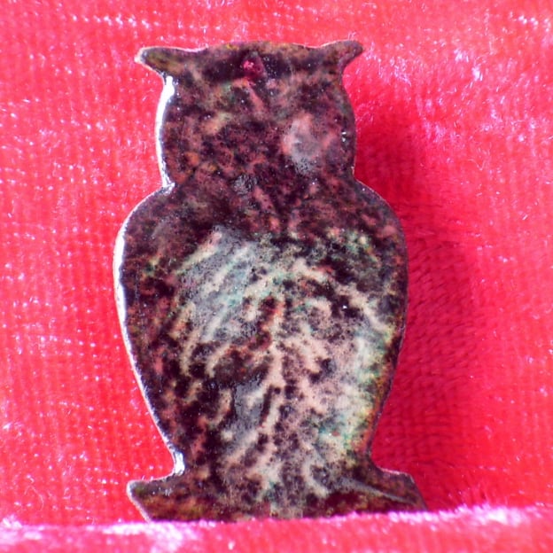 To make the owl I first built up several layers of clear enamel on the copper base. I covered this with a thin layer of black enamel into which I drew the owl's features. The copper base shows these in tones of golden brown.