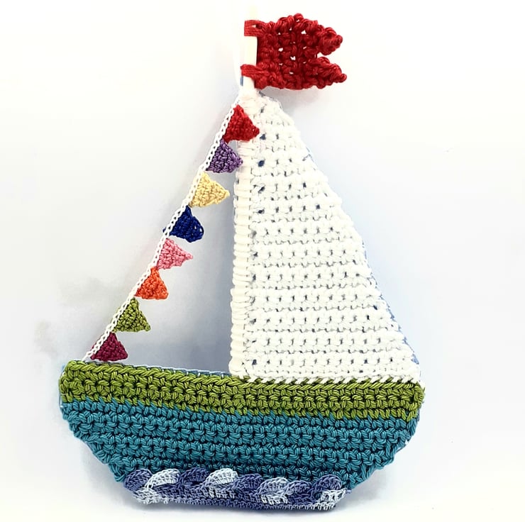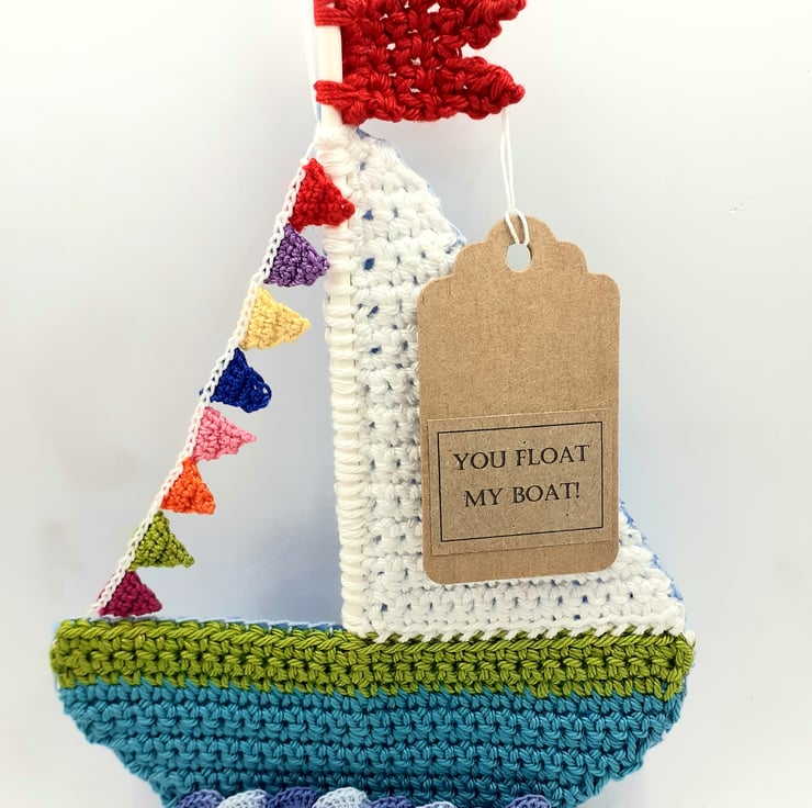 This boat with its cheerful bunting and little waves lapping at its base would make a lovely keepsake alternative to a greetings card. It is crocheted in cotton and there is a lolly stick sewn to the back of the sail like a mast for added strength. The boat has been stiffened with PVA and backed with a layer of felt.