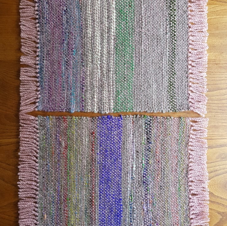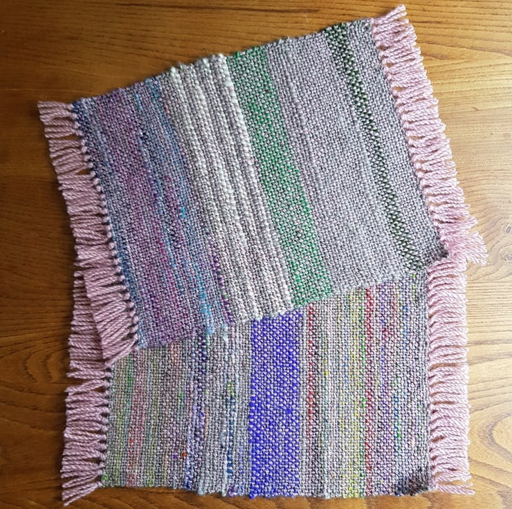 For years I have collected the fibres that have been left at the end of workshops with the idea that I would use them at some point for something! I prepared the fibre by first carding (combing) it all before then spinning it to produce a beautiful yarn. This yarn was used within the weft to weave with before the placemats were then washed and ironed. This has resulted in a series of placemats in 5 colourways.