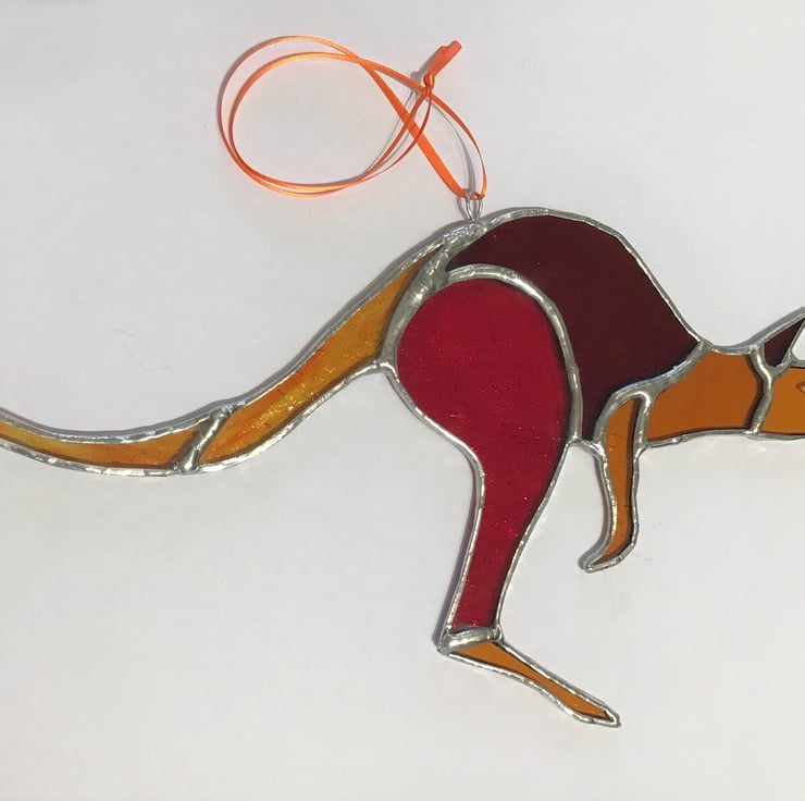 A stained glass Kangaroo made from red and orange glass, with a ribbon for hanging.