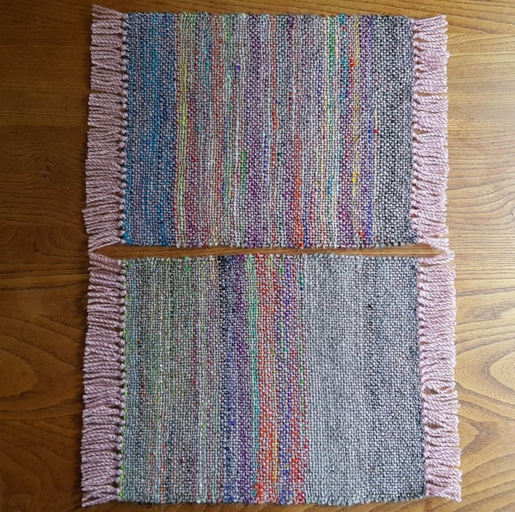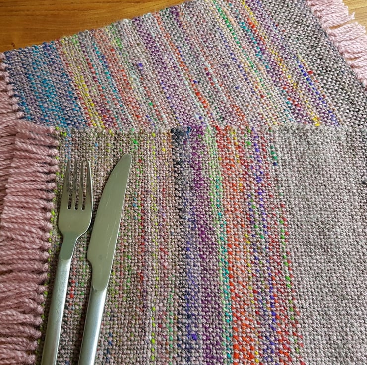 These beautiful hand woven placemats will be sure to brighten up any table all year round. They are woven using a unique handspun yarn in the weft and a solid coloured yarn in the warp to ensure strength. I have woven the placemats using plain weave, sometimes also referred to as tabby weave to allow the hand spun yarn to shine!