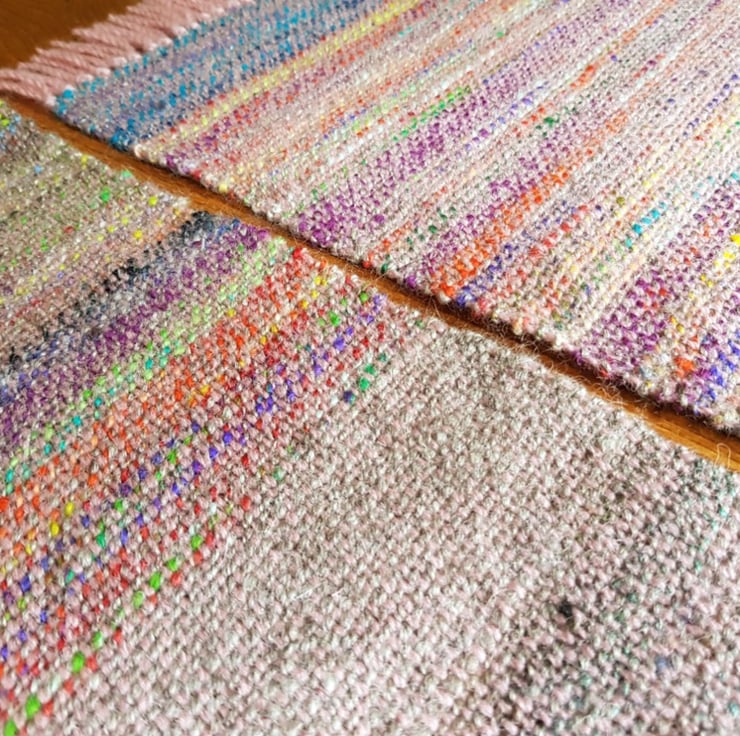 For years I have collected the fibres that have been left at the end of workshops with the idea that I would use them at some point for something! I prepared the fibre by first carding (combing) it all before then spinning it to produce a beautiful yarn. This yarn was used within the weft to weave with before the placemats were then washed and ironed. This has resulted in a series of placemats in 5 colourways.