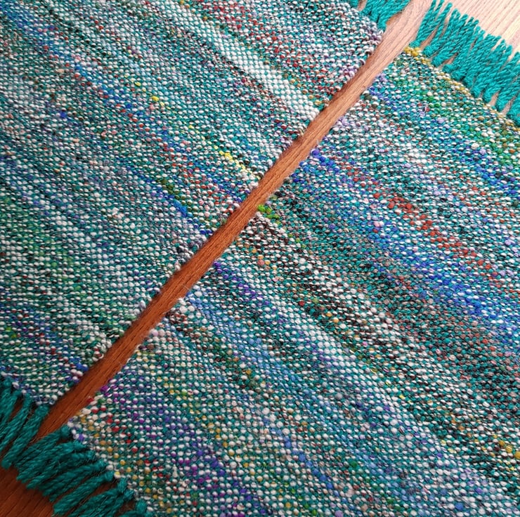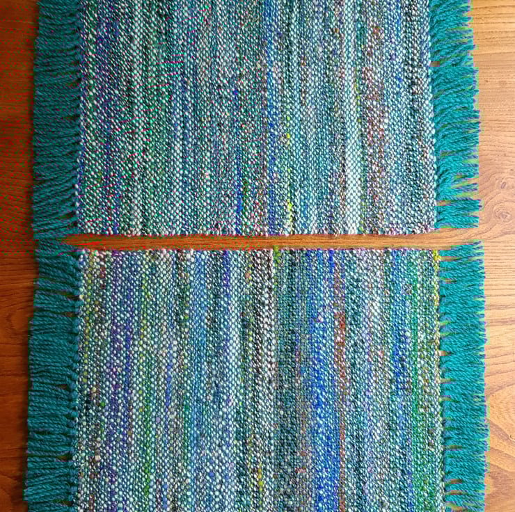 For years I have collected the fibres that have been left at the end of workshops with the idea that I would use them at some point for something! If you follow me on social media you will have seen over the last few months the development of this project. Fibres being combed and spun, yarn woven before the placemats are washed and ironed. This has resulted in a series of placemats in 5 colourways.