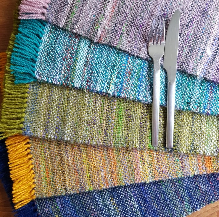 These beautiful hand woven placemats will be sure to brighten up any table all year round. They are woven using a unique handspun yarn in the weft and a solid coloured yarn in the warp to ensure strength. I have woven the placemats using plain weave, sometimes also referred to as tabby weave to allow the hand spun yarn to shine!