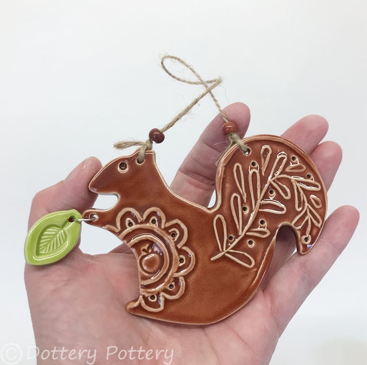 This cute little pottery squirrel has been cut from white earthenware clay, decorated and fired. It has then been glazed with bright, glossy glazes and fired again to 1100 degrees. It hangs from a brown string and is finished with matching beads. 10cm wide x 9cm high x 0.8cm deep. Suitable for indoor or outdoor use.