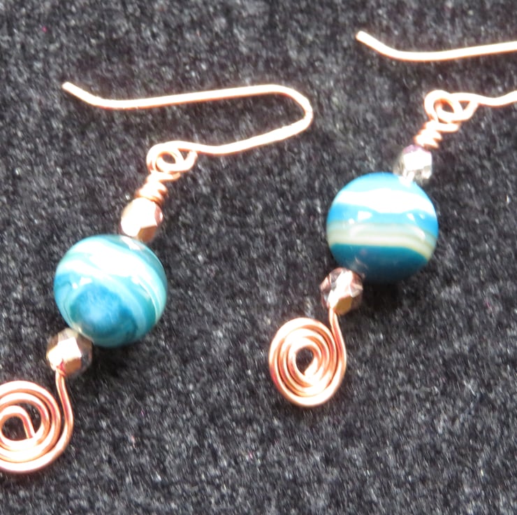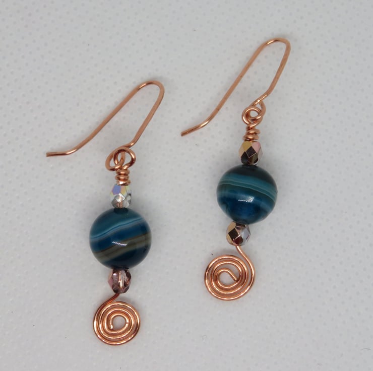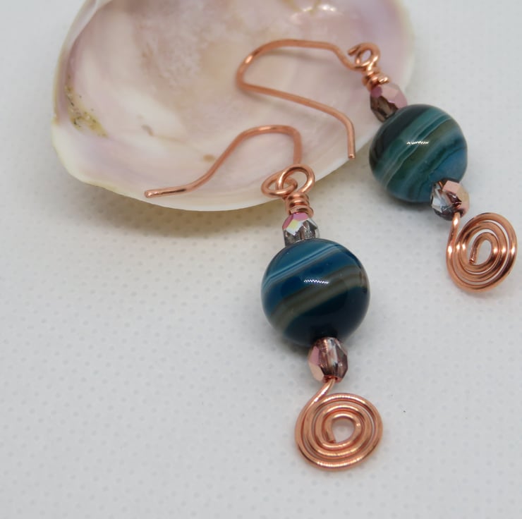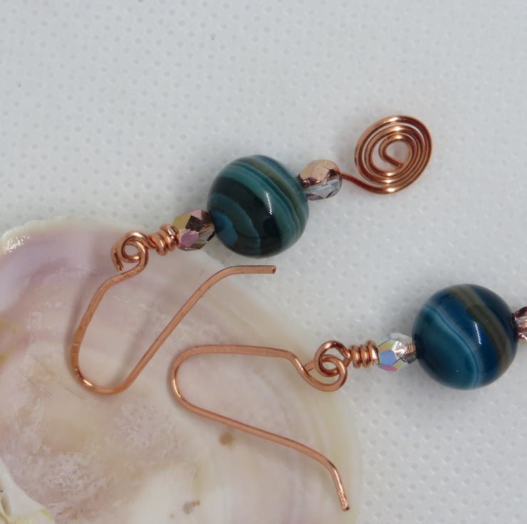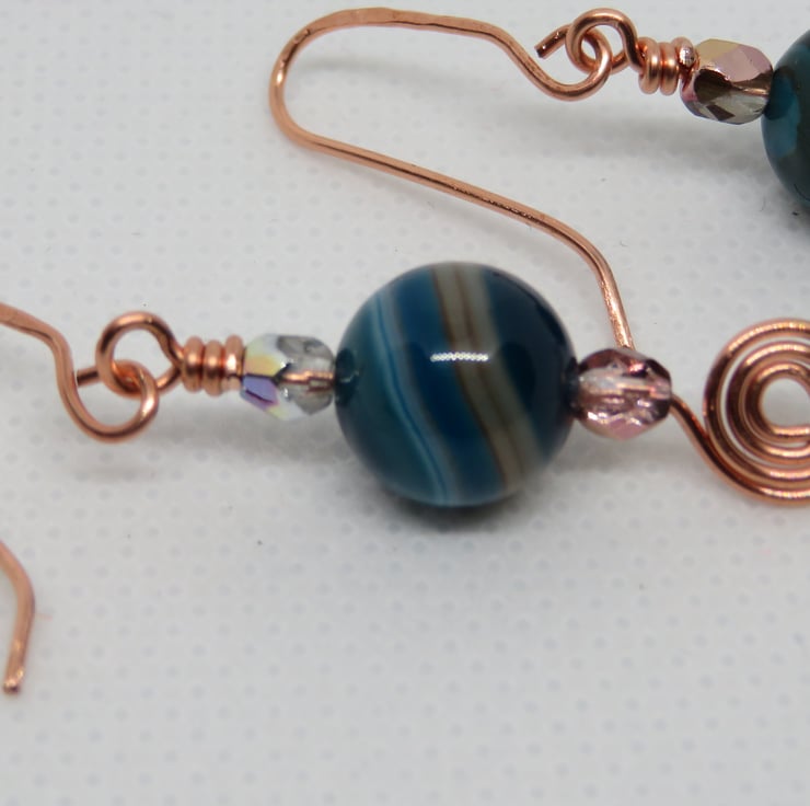 A copper spiral forms the base of each earring, to which I have added firepolished beads with a copper tinge and a banded agate bead in shades of turquoise, blue and white. The ear hooks are handmade and have been gently hammered to strengthen them and give a little texture. The hook ends have been filed smooth. I have used bare copper to make the spirals and ear hooks.