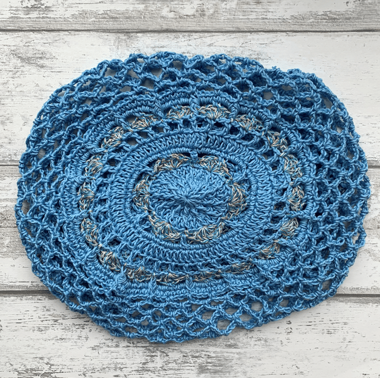 Handmade 100% cotton reusable eco friendly bag with mandala feature on the bottom and a hint of sparkly yarn throughout too!