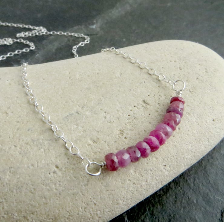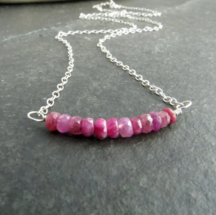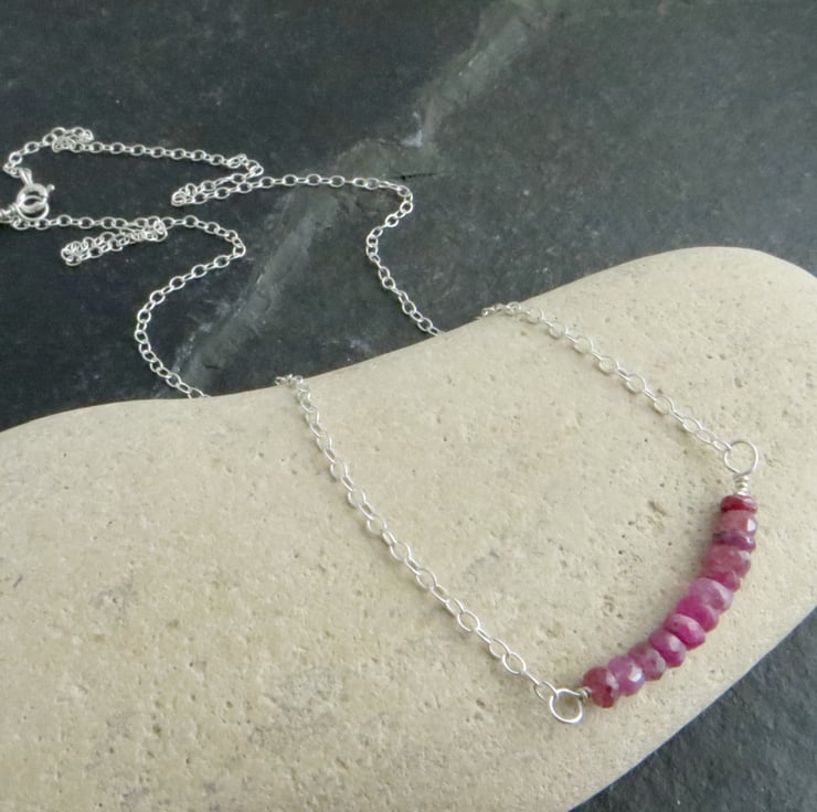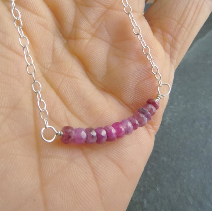 It features a row of tiny facet cut ruby beads in vibrant raspberry, arranged on sterling silver wire and finished either side with fine sterling trace chain and a bolt ring clasp. Simple and delicate, it looks great dressed up or down!