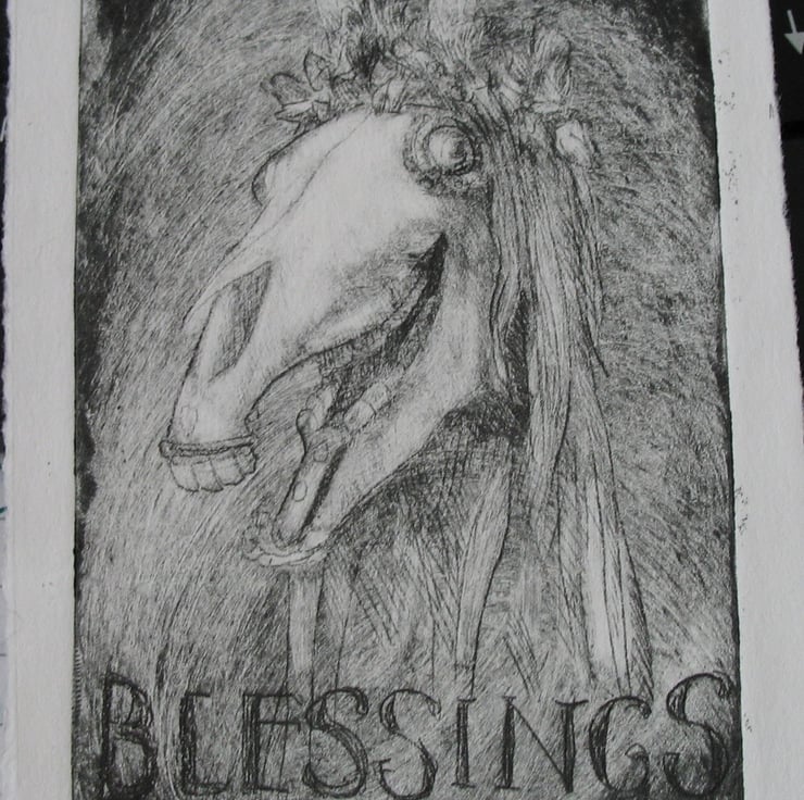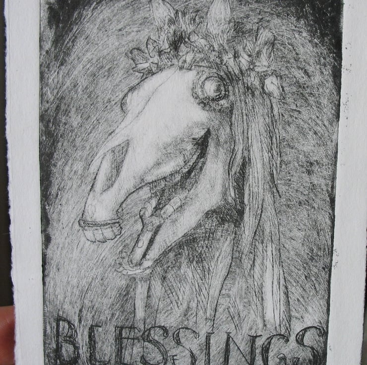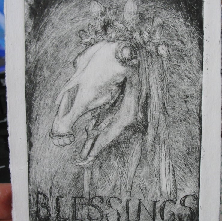 This open edition drypoint etching measures approximately 3"x4" and was printed from a plexiglass plate, etched with fine etching tools using black oil-based ink on white paper.