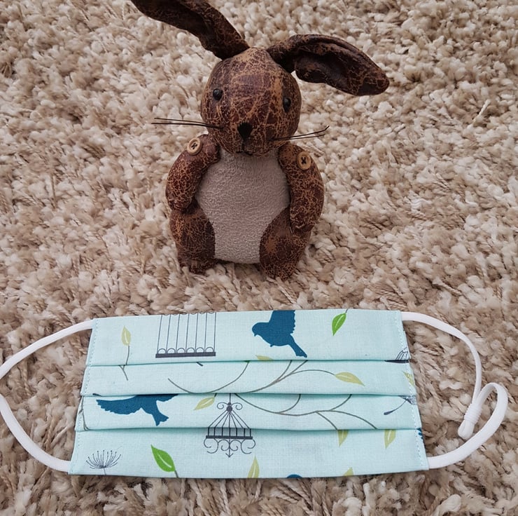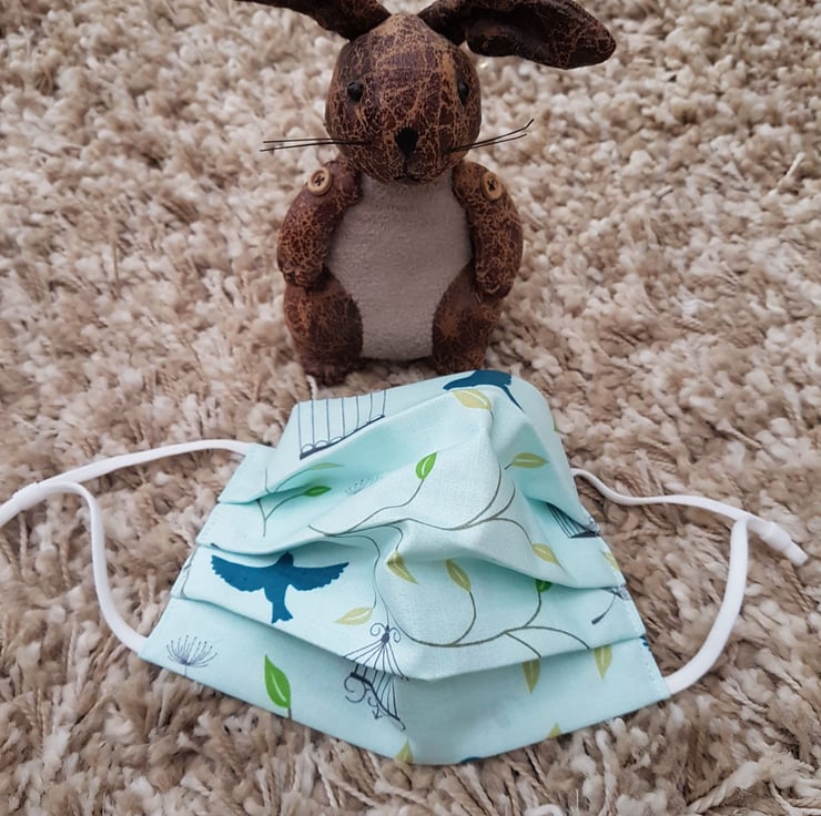 Adult face covering/mask made from a bird cage print on a pale blue/green cotton. The face mask is made with 2 layers of cotton forming an inner pocket for a filter (not included) and is fastened over the ears with 2 loops of elastic and a toggle adjuster.