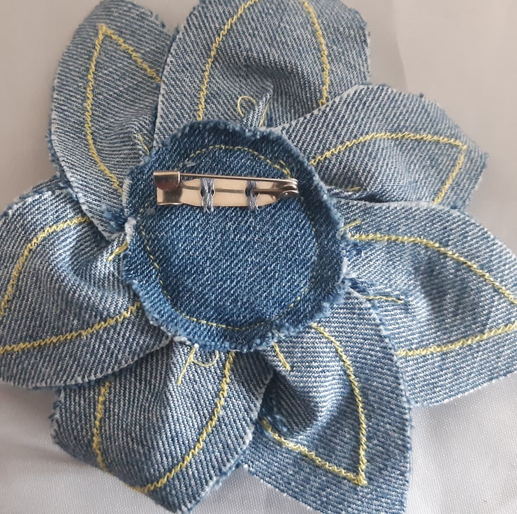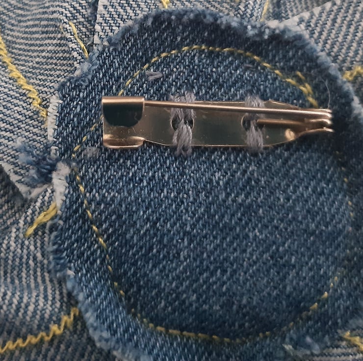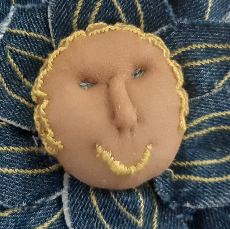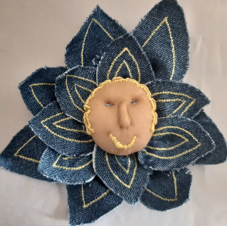 Cute unique and quirky brooch that resembles a flower baby. The brooch is made from scraps of denim fabric and upcycled tights. As the face is stitched it creates its own character making each one truly unique. The face that forms determines style of the hair. Each brooch is securely stitched to the metal pin to ensure a secure fitting.