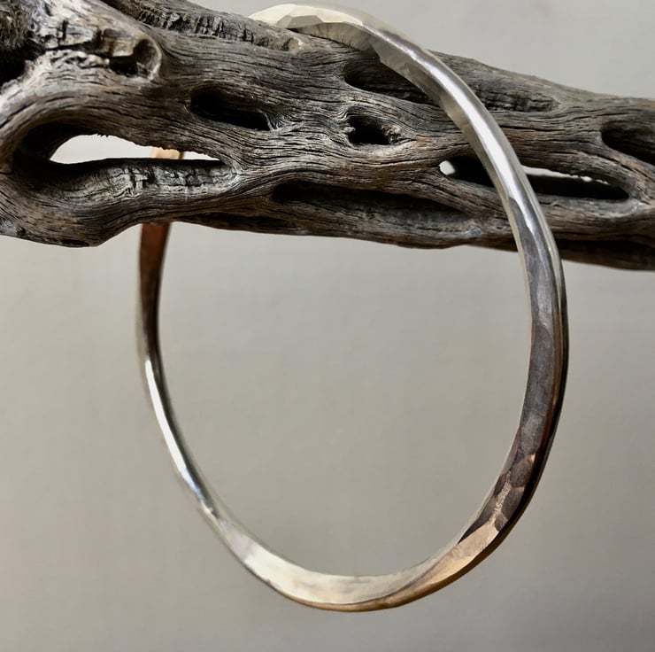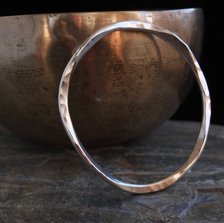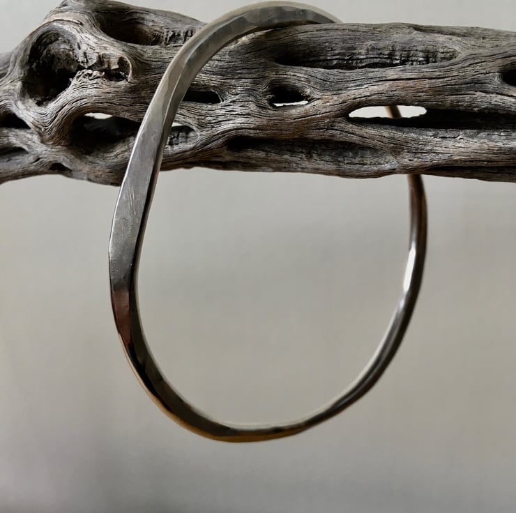 I have handmade this sterling silver hammered bangle, using 3.5 mm (7 gauge) silver so it has a good weight. I have hammered the bracelet quite heavily to give it a deliberately 'wonky' uneven artisan twisty look, with some texture and soft shine.