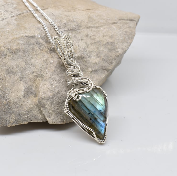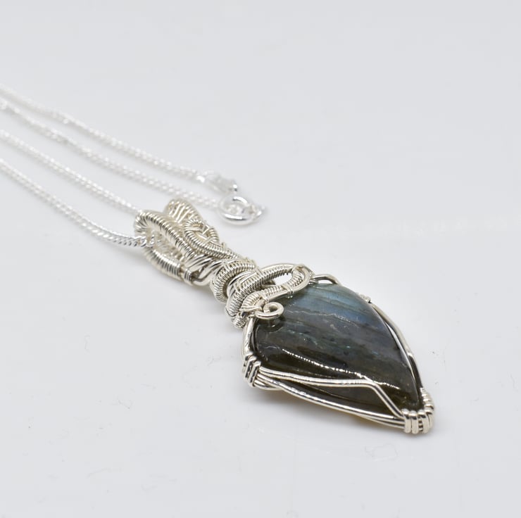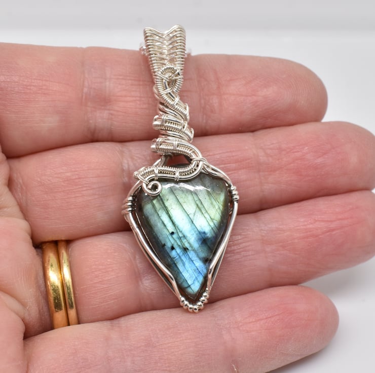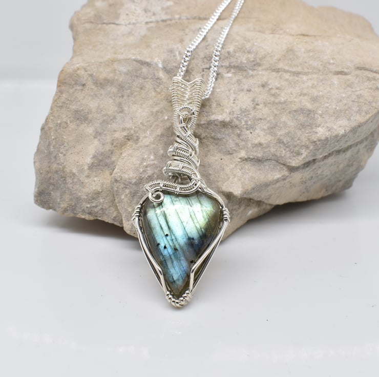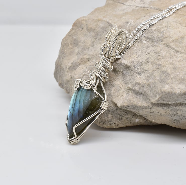 I have wire wrapped and hand woven the setting around this beautiful labradorite using sterling and fine silver wire. The thicker wires are sterling silver and the weaving wire is fine silver which is 99% pure.