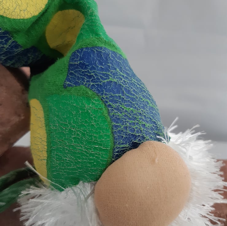 This charming, hand-stitched gnome is a truly one-of-a-kind creation, made with love from upcycled fabrics. The body and hat are crafted from repurposed T-shirts, while the nose is made from upcycled tights, giving each gnome a sustainable, eco-friendly touch.