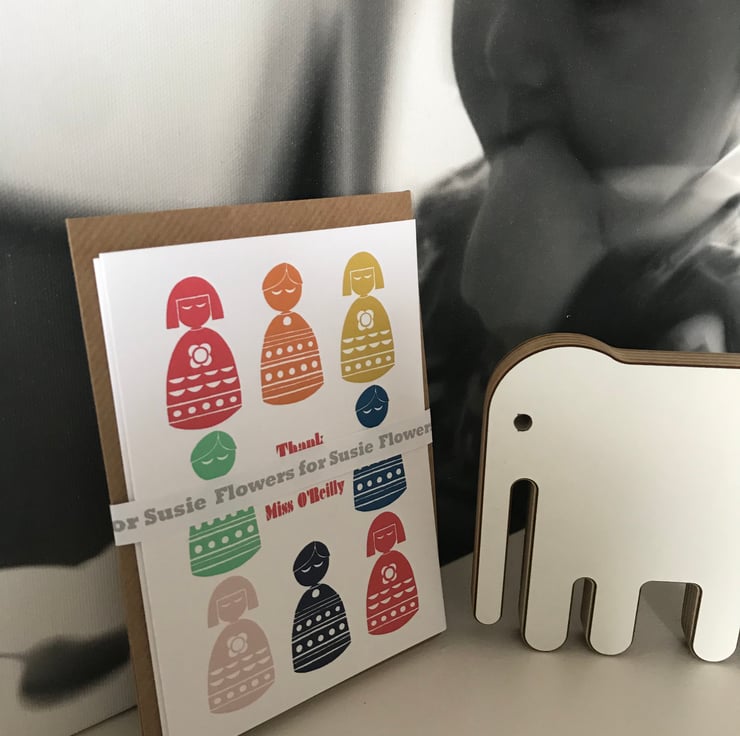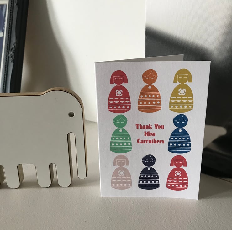 All my designs are Inspired by Scandinavian and mid century pattern and colour. I love the simplistic aesthetic and try to create this in my work. My inspiration for this particular was my little boys bond with his teacher. She is amazing so he ask me to make her an extra special card so she knows how fab she is. Rainbow babushka children symbolise the hope our children bring for the future with the support of their teachers.